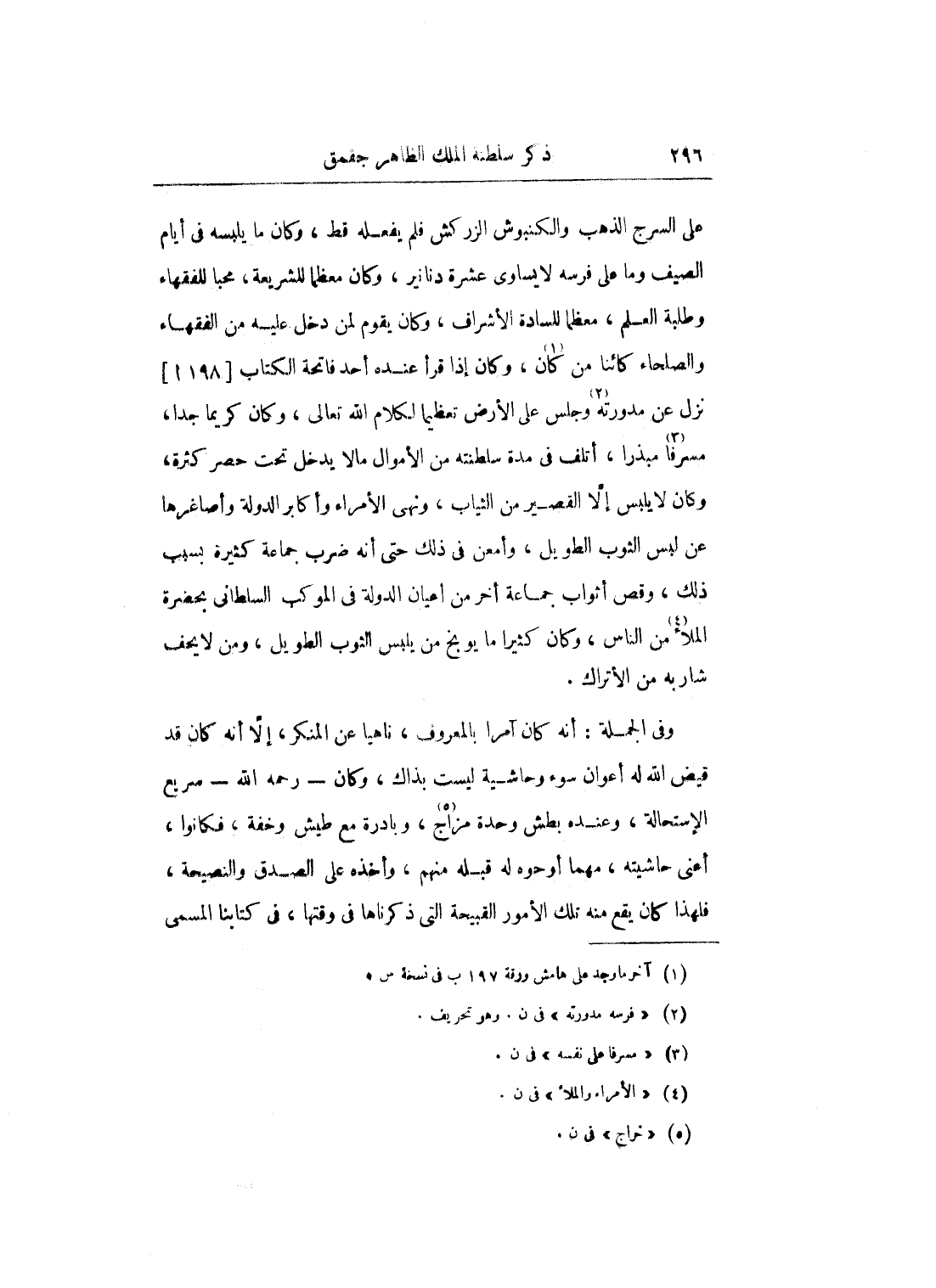 على السرج الذهب والكنبوش الزركش فلم يفعله قط، وكان ما يلبسه في أيام الصيف وما على فرسه لا يساوي عشرة دنانير، وكان معظماً للشريعة، محباً للفقهاء وطلبة العلم، معظماً للسادة الأشراف، وكان يقوم لمن دخل عليه من الفقهاء والصلحاء كائناً من كان، وكان إذا قرأ عنده أحد فاتحة الكتاب نزل عن مدورته وجلس على الأرض تعظيماً لكلام الله تعالى، وكان كريماً جداً، مسرفاً مبذراً، أتلف في مدة سلطنته من الأموال مالا يدخل تحت حصر كثرة، وكان لا يلبس إلا القصير من الثياب، ونهى الأمراء وأكابر الدولة وأصاغرها عن لبس الثوب الطويل، وأمعن في ذلك حتى أنه ضرب جماعة كثيرة بسبب ذلك، وقص أثواب جماعة أخر من أعيان الدولة في الموكب السلطاني بحضرة الملأ من الناس، وكان كثيراً ما يوبخ من يلبس الثوب الطويل، ومن لا يحف شاربه من الأتراك.