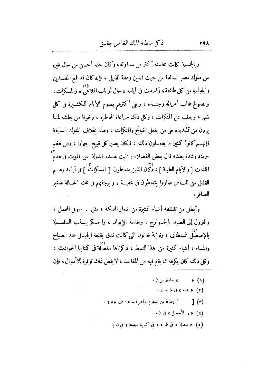 وأبطل من تقشفه أشياء كثيرة من شعار المملكة، مثل: سوق المحمل، والنرول إلى الصيد بالجوارح، وخدخمة الإيوان، الحكم بباب السلسلة بالإصطبل السلطاني، ونوابة خاتون التي كانت تدق بقلعة الجبل عند الصباح والمساء، أشياء كثيرة من هذا النمط، ذكرناها مفصلة في كتابنا الحوادث، وكل ذلك كان يكرهه مما يقع فيه من المفاسد، لا يفعل ذلك توفرة للأموال، فإن