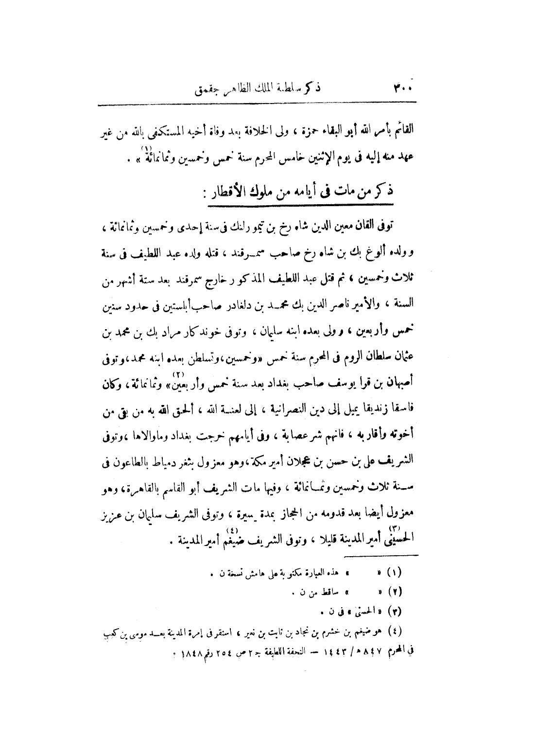 توفي القان معين الدين شاه رخ بن تيمورلنك في سنة إحدى وخمسين وثمانمائة، وولده ألوغ بك بن شاه رخ صاحب سمرقند، قتله ولده عبد اللطيف في سنة ثلاث وخمسين، ثم قتل عبد اللطيف المذكور خارج سمرقند بعد سنة أشهر من السنة، والأمير ناصر الدين بك محمد بن دلغادر صاحب أبلستين في حدود سنين خمس وأربعين، وولى بعده ابنه سليمان، وتوفي خوند كار مراد بك بن محمد بن عثمان سلطان الروم في المحرم سنة خمس وخمسين وتسلطن بعده ابنه محمد، بن عثمان سلطان الروم في المحرم سنة خمس وخمسين وتسلطن بعده ابنه محمد، وتوفي أصبهان بن قرا يوسف صاحب بغداد بعد سنة خمس وأربعين وثمانمائة، وكان فاسقاً زنديقاً يميل إلى دين النصرانية، إلى لعنة الله، ألحق الله به من بقي من أخوته وأقاربه، فانهم شر عصابة، وفي أيامهم خرجت بغداد وما والاها، وتوفي الشريف علي بن حسن بن عجلان أمير مكة، وهو معزول بثغر دمياط بالطاعون في سنة ثلاث وخمسين وثمانمائة، وفيها مات الشريف أبو القاسم بالقاهرة، وهو معزول أيضاً بعد قدومه من الحجاز بمدة يسيرة، وتوفي الشريف سليمان بن عزيز الحسيني أمير المدينة قليلاً، وتوفي الشريف ضيغم أمير المدينة.