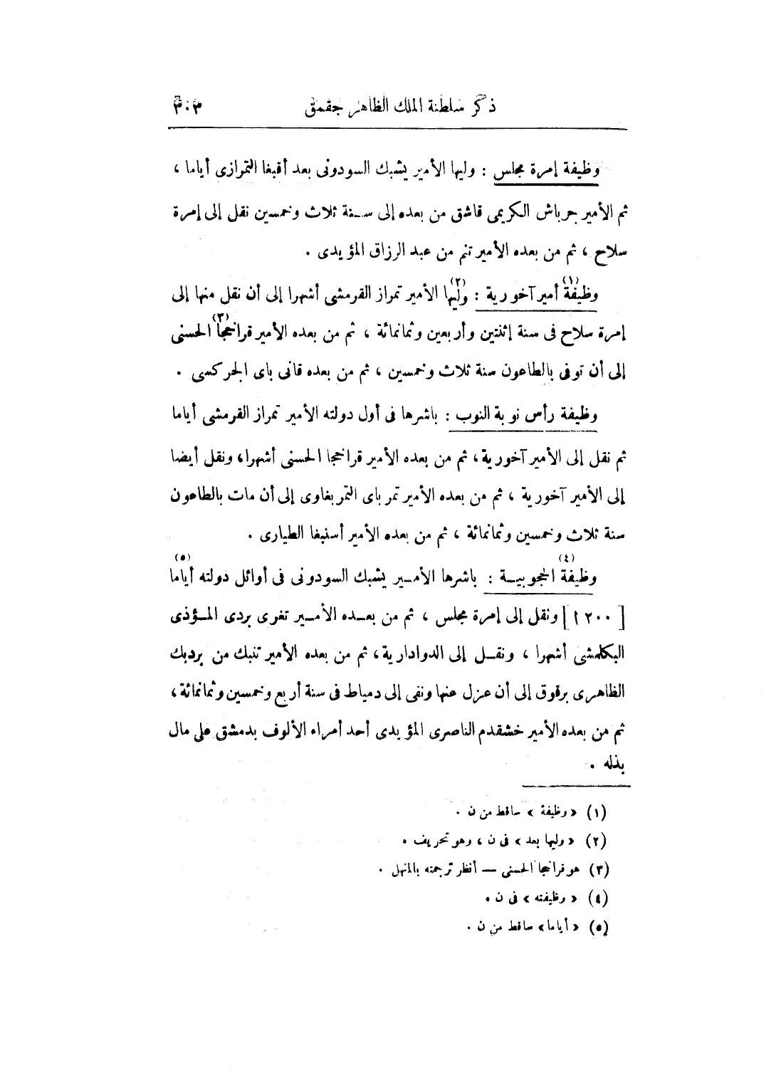 وظيفة الحجوبية: باشرها الأمير يشبك السودوني في أوائل دولته أياماً ونقل إلى إمرة مجلس، ثم من بعده الأمير تغرى بردى المؤذى البكمشى أشهرا، ونقل إلى الدوادارية، ثم من بعده الأمير تنبك من بردبك الظاهري برقوق إلى أن عزل عنها ونفى إلى دمياط في سنة أربع وخمسين وثمانمائة، ثم من بعده الأمير خشقدم الناصري المؤيدي أحد أمراء الألوف بدمشق على مال بذله.