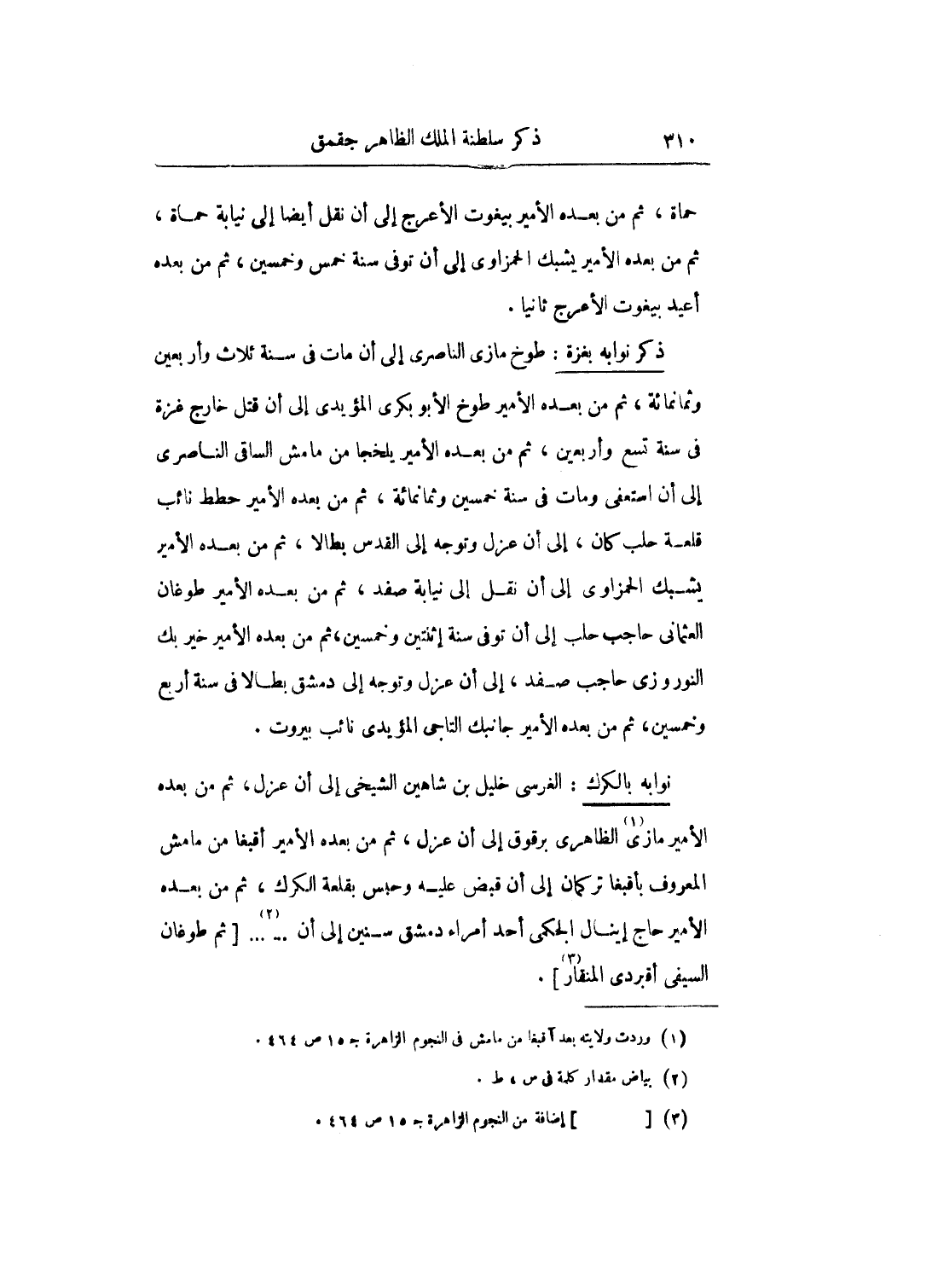 حماة، ثم من بعده الأمير بيغوت الأعرج إلى أن نقل أيضاً إلى نيابة حماة، ثم من بعده الأمير يشبك الحمزاوي إلى أن توفي سنة خمس وخمسين، ثم من بعده أعيد بيغوت الأعرج ثانياً.