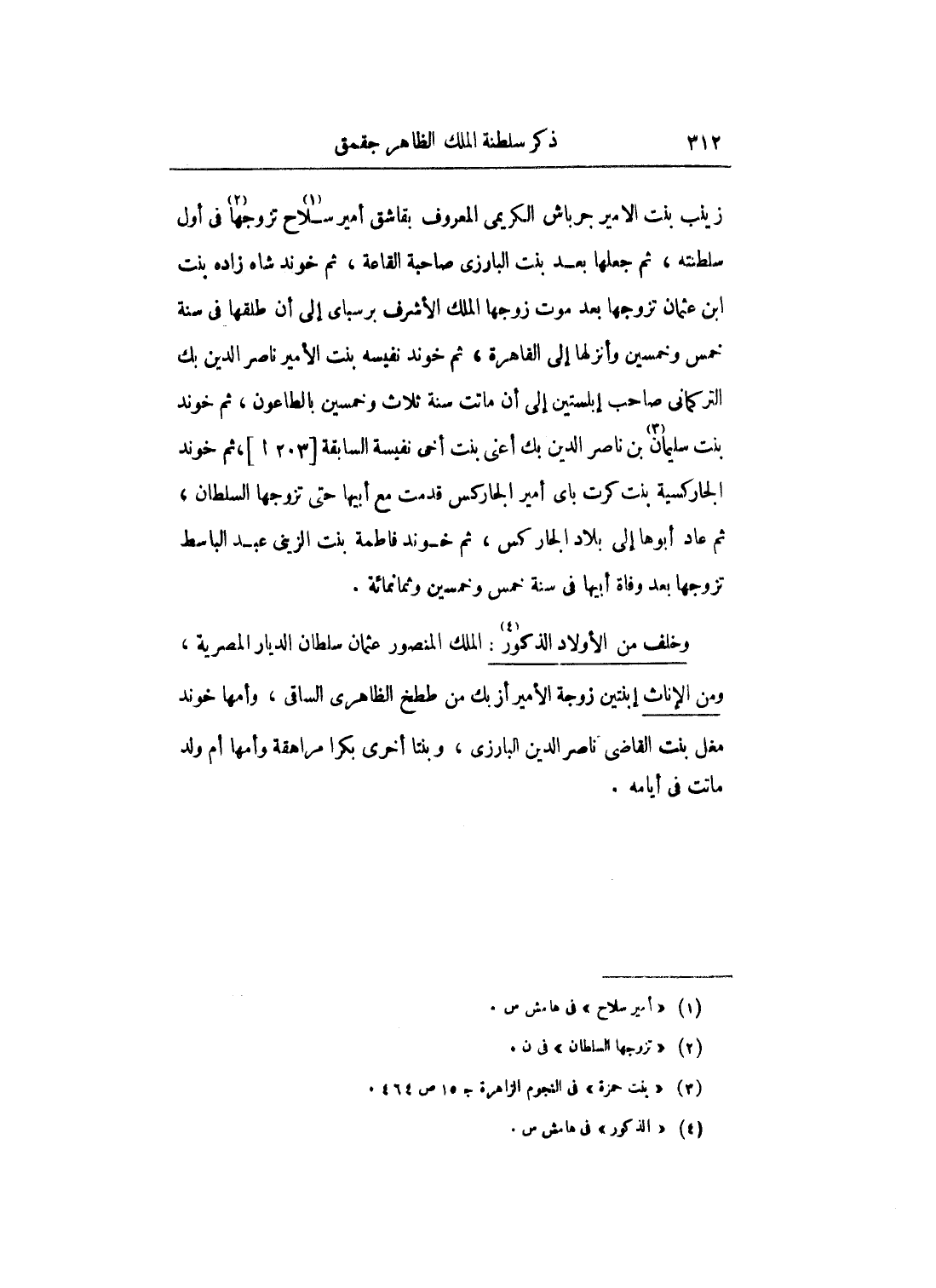 زينب الأمير جرباش الكريمي المعروف بقاشق أمير سلاح تزوجها في أول سلطنته، ثم جعلها بعد بنت البارزي صاحبة القاعة، ثم خوند شاه زاده بنت أنب عثمان تزوجها بعد موت زوجها الملك الأشرف برسباي إلى أن طلقها في سنة خمس وخمسين وأنزلها إلى القاهرة، ثم خوند نفيسه بنت الأمير ناصر الدين بك التركماني صاحب إبلستين إلى ن ماتت سنة ثلاث وخمسين بالطاعون، ثم خوند بنت سليمان بن نصار الدين بك أعنى بنت أخي نفيسة السابقة، ثم خوند الجاركسية بنت كرت باي أمير الجاركس، قدمت مع أبيها حتى تزوجها السلطان، ثم عاد أبوها إلى بلاد الجاركس، ثم خوند فاطمة بنت الزيني عبد الباسط تزوجها بعد وفاة أبيها في سنة خمس وخمسين وثمانمائة.