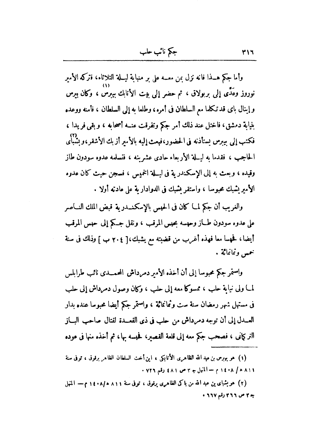 واستمر جكم محبوساً إلى أن أخذه الأمير دمرداش المحمدي نائب طرابلس لما ولى نيابة حلب، ممسوكاً معه إلى حلب، وكان وصول دمرداش إلى حلب في مستهل شهر رمضان سنة ست وثمانمائة، واستمر جكم أيضاً محبوساً عنده بدار العدل إلى أن توجه دمرداش من حلب في ذي القعدة لقتال صاحب الباز التركماني، فصحب جكم معه إلى قلعة القصير، فحبسه بها، ثم أخذه منها في عوده