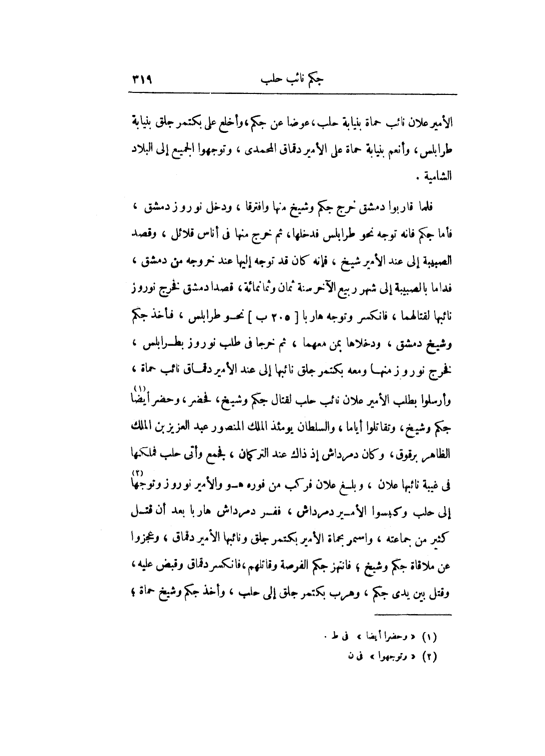 فلما قاربوا دمشق خرج جكم وشيخ منها وافترقا، ودخل نوروز دمشق، فأما جكم فإنه توجه نحو طرابلس فدخلها، ثم خرج منها في أناس قلائل، وقصد الصبيبة إلى عند الأمير شيخ، فإنه كان قد توجه إليها عند خروجه من دمشق، فداما بالصبيبة إلى شهر ربيع الآخر سنة ثمان وثمانمائة، قصدا دمشق فخرج نوروز نائبها لقتالهما، فانكسر وتوجه هارباً نحو طرابلس، فأخذ جكم وشيخ دمشق، ودخلاها بمن معهما، ثم خرجا في طلب نوروز بطرابلس، فخرج نوروز منها ومعه بكتمر جلق نائبها إلى عند الأمير دقماق نائب حماة، وأرسلوا بطلب الأمير علان نائب حلب لقتال جكم وشيخ، فحضر، وحضر أيضاً جكم وشيخ، وتقاتلوا أياماً، والسلطان يومئذ الملك المنصور عبد العزيز بن الملك الظاهر برقوق، وكان دمرداش إذ ذاك عند التركمان، فجمع وأتى حلب فملكها في غيبة نائبها علان، وبلغ علان فركب من فوره هو والأمير نوروز وتوجها إلى حلب وكبسوا الأمير بكتمر جلق ونائبها الأمير دقماق، وعجزوا عن ملاقاة جكم وشيخ؛ فانتهز جكم الفرصة وقاتلهم، فانكسر دقماق وقبض عليه، وقتل بين يدي جكم، وهرب بكتمر جلق إلى حلب، وأخذ جكم وشيخ حماة؛