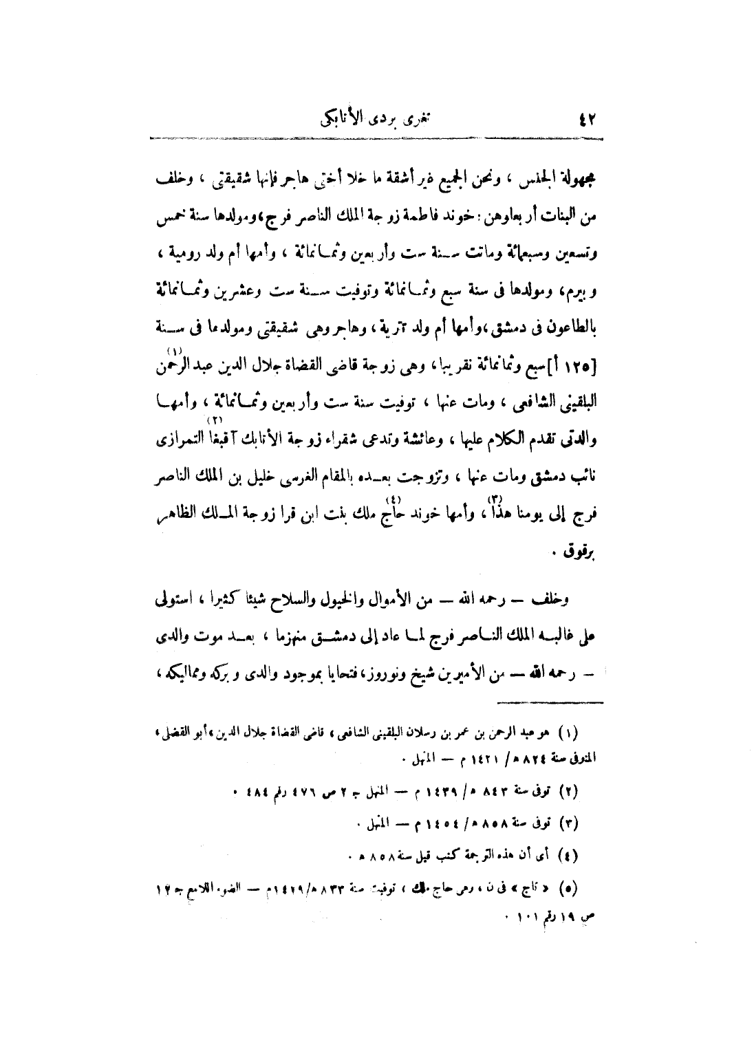 مجهولة الجنس، ونحن الجميع غير أشقة ما خلا أختى هاجر فإنها شقيقتي، وخلف من البنات أربعلوهن: خوند فاطمة زوجة الملك الناصر فرج، ومولدها سنة خمس وتسعين وسبعمائة وماتت سنة ست وأربعين وثمانمائة، وأمها أم ولد رومية، وبيرم، ومولدها في سنة سبع وثمانمائة، وتوفيت سنة ست وعشرين وثمانمائة بالطاعون في دمشق، وأمها أم ولد تترية، وهاجر وهي شقيقتي ومولدها في سنة سبع وثمانمائة تقريباً، وهي زوجة قاضي القضاة جلال الدين عبد الرحمن البلقيني الشافعي، ومات عنها، توفيت سنة ست وأربعين وثمانمائة، وأمها والدتي تقدم الكلام عليها، وعائشة وتدعي شقراء زوجة الأتابك آقبغا التمرازى نائب دمشق ومات عنها، وتزوجت بعده بالمقام الغرسى خليل بن الملك الناصر فرج إلى يومنا هذا، وأمها خوند حاج ملك بنت ابن قرا زوجة الملك الظاهر برقوق.