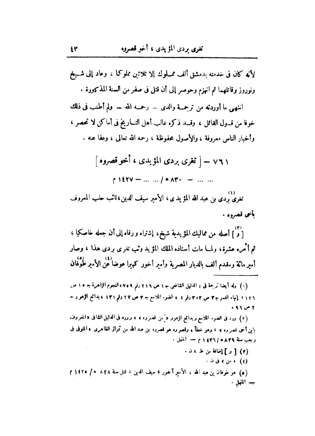 لأنه كان في خدمته بدمشق ألف مملوك إلا ثلاثين مملوكاً، وعاد إلى شيخ ونوروز وقاتلهما ثم انهزم وحوصر إلى أن قتل في صفر من السنة المذكورة.