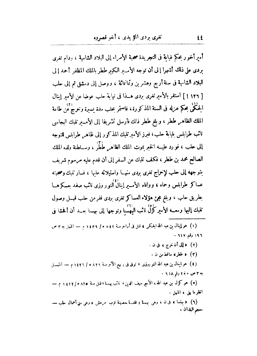 أمير أخور بحكم غيابة في التجريدة صحبة الأمراء إلى البلاد الشامية، ودام تغرى بردى على ذلك أشهرا إلى أن توجه الأمير الكبير ططر بالملك المظفر أحمد إلى البلاد الشامية في سنة أربع وعشرين وثمانمائة، ووصل إلى دمشق ثم إلى حلب استقر بالأمير تغرى بردى هذا في نيابة حلب عوضاً عن الأمير إينال الجكمى بحكم عزله في السنة المذكورة، فاستمر بحلب مدة يسيرة وخرج عن طاعة الملك الظاهر ططر، وبلغ ططر ذلك فأرسل تشريفا إلى الأمير تنبك الجباسى نائب طرابلس بنيابة حلب، فبرز الأمير تنبك المذكور إلى ظاهر طرابلس للتوجه إلى حلب، فورد عليه الخبر بموت الملك الظاهر ططر، وسلطنة ولده الملك الصالح محمد بن ططر، فكف تنبك عن السفر إلى أن قدم عليه مرسوم شريف بتوجهه إلى حلب لإخراج تغرى بردى منها واستيلائه عليها فسار تنبك وصحبته عساكر طرابلس وحماه، ووافاه الأمير إينال النور وزى نائب صفد بعسكرها بطريق حلب، وبلغ مجيء هؤلاء العساكر تغرى بردى ففر من حلب قبل وصول تنبك إليها ومعه الأمير كزل نائب البهسنا وتوجها إلى بهسنا بعد أن أفحشا في