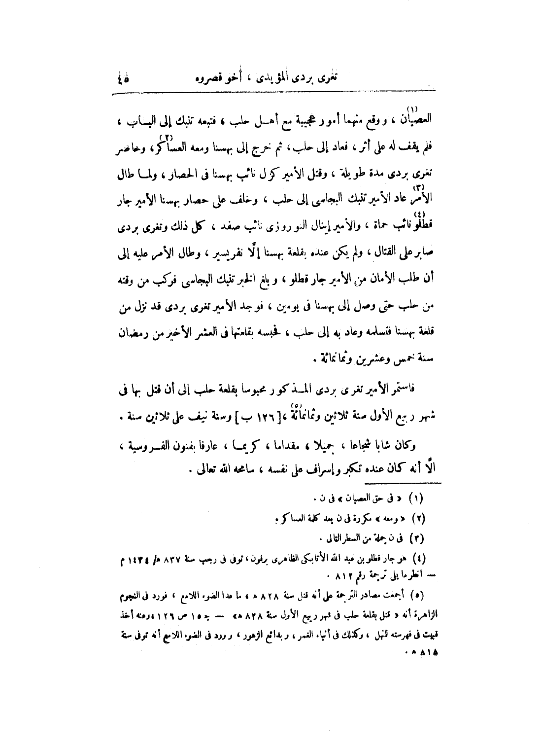 العصيان، ووقع منهما أمور عجيبة مع أهل حلب، فتبعه تنبك إلى الباب، فلم يقف له على أثر، فعاد إلى حلب، ثم خرج إلى بهسنا ومعه العساكر، وحاصر تغرى بردى مدة طويلة، وقتل الأمير كزل نائب بهسنا في الحصار، ولما طال الأمر عاد الأمير تنبك الجباسى إلى حلب، وخلف على حصار بهسنا الأمير جار قطلو نائب حماة، والأمير إينال النوروزى نائب صفن كل ذلك وتغرى بردى صابر على القتال، ولم يكن عنده بقلعة بهسنا إلا نفر يسير، وطال الأمر عليه إلى أن طلب الأمان من الأمير جار قطلو، وبلغ الخبر تنبك البجاسى فركب من وقته من حلب حتى وصل إلى بهسنا في يومين، فوجد الأمير تغرى بردى قد نزل من قلعة بهسنا فتسلمه وعاد به إلى حلب، فحبسه بقلعتها في العشر الأخير من رمضان سنة حمس وعشرين وثمانمائة.