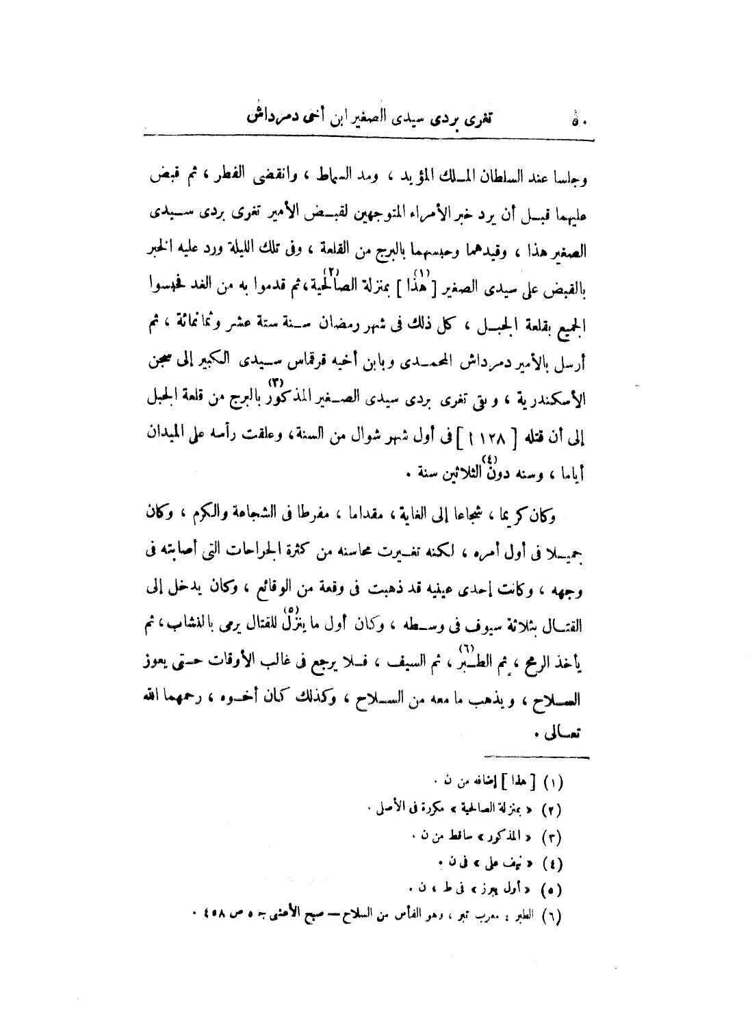 وجلسا عند السلطان الملك المؤيد، ومد السماط، وانقضى، ثم قبض عليهما قبل أن يرد خبر الأمراء المتوجهين لقبض الأمير تغرى بردى سيدي الصغير هذا، وقيدهما وحبسهما بالبرج من القلعة، وفي تلك الليلة ورد عليه الخبر الجميع بقلعة الجبل، كل ذلك في شهر رمضان سنة ستة عشر وثمانمائة، ثم أرسل بالأمير دمرداش المحمدى وبابن أخيه قرقماس سيدي الكبير إلى سجن الأسكندرية، وبقى تغرى بردى سيدي الصغير المذكور بالبرج من قلعة الجبل إلى أن قتله في أول شهر من السنة وعلقت رأسه على الميدان أياماً، وسنه دون الثلاثين سنة.