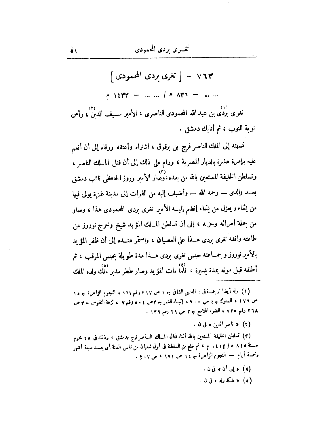 نسبته إلى الملك الناصر فرج بن رقوق، اشتراه وأعتقه ورقاه إلى أن أنعم عليه بإمرة عشرة بالديار المصرية، ودام على ذلك إلى أن قتل الملك الناصر، وتسلطن الخليفة المستعين بالله من بعده، وصار الأمير نوروز الحافظى نائب دمشق بعد والدي رحمه الله وأضيف إليه من الفرات إلى مدينة غزة يولى فيها من يشاء ويعزل من يشاء إنضم إليه الأمير تغرى بردى المحمودي هذا، وصار من جملة أمرائز وحزبه، إلى أن تسلطن الملك المؤيد شيخ وخرج نوروز عن طاعته وافقه تغرى بردى هذا على العصيان، واستمر عنده إلى أن ظفر المؤيد بالأمير نوروز وجماعته حبس تغرى بردى هذا مدة طويلة بحبس المرقب، ثم أطلقه قبل موته بمدة يسيرة، فلما مات المؤيد وصار ططر مدبر ملك ولده الملك