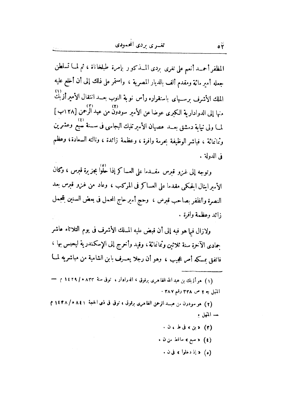 المظفر أحمد أنعم على تغرى بردى المذكور بإمرة طبلخاناة، ثم لما تسلطن جعله أمير مائة ومقدم ألف بالديار المصرية، واستمر على ذلك إلى أن أخلع عليه الملك الأشرف برسباى باستقراره رأس نوبة النوب بعد انتقال الأمير أزبك منها إلى الدوادارية الكبرى عوضاً عن الأمير سودون من عبد الرحمن لما ولى نيابة دمشق بعد عصيان الأمير تنبك البجاسى في سنة سبع وعشرين وثمانمائة، فباشر الوظيفة بحرمه وافرة، وعظمة زائدة، ونالته السعادة، وعظم في الدولة.