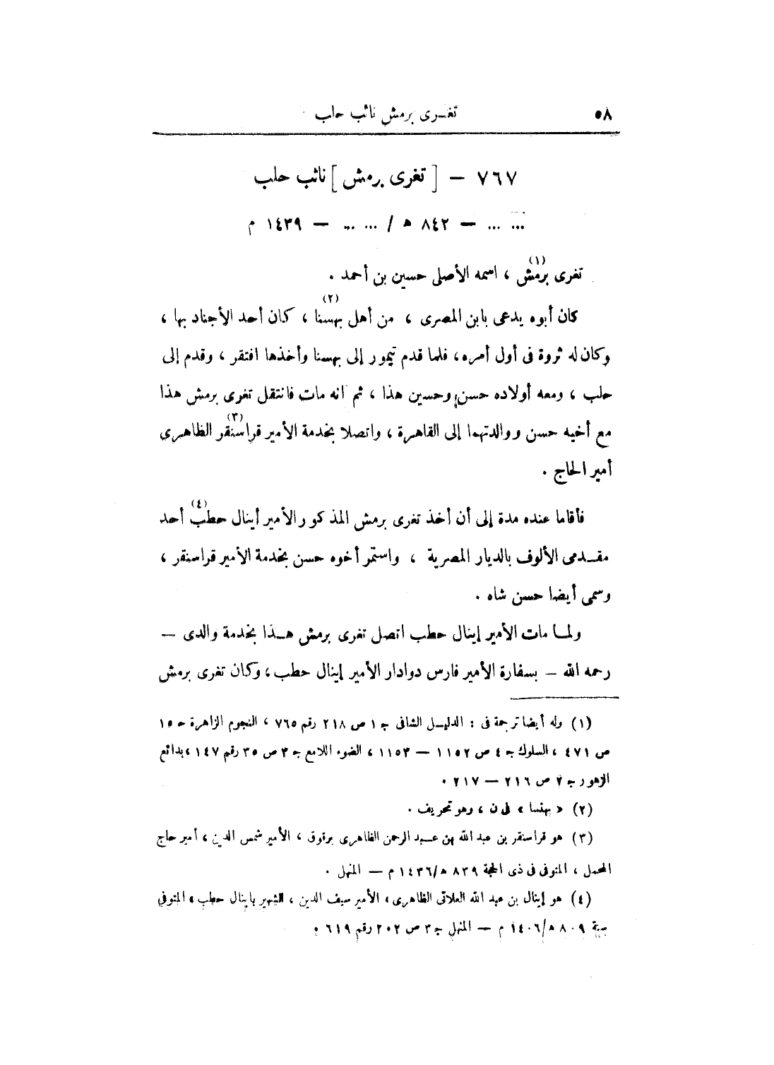 ولما مات الأمير إينال حطب اتصل تغرى برمش هذا بخدمة والدي رحمه الله بسفارة الأمير فارس دوادار الأمير إينال حطب، وكان تغرى برمش