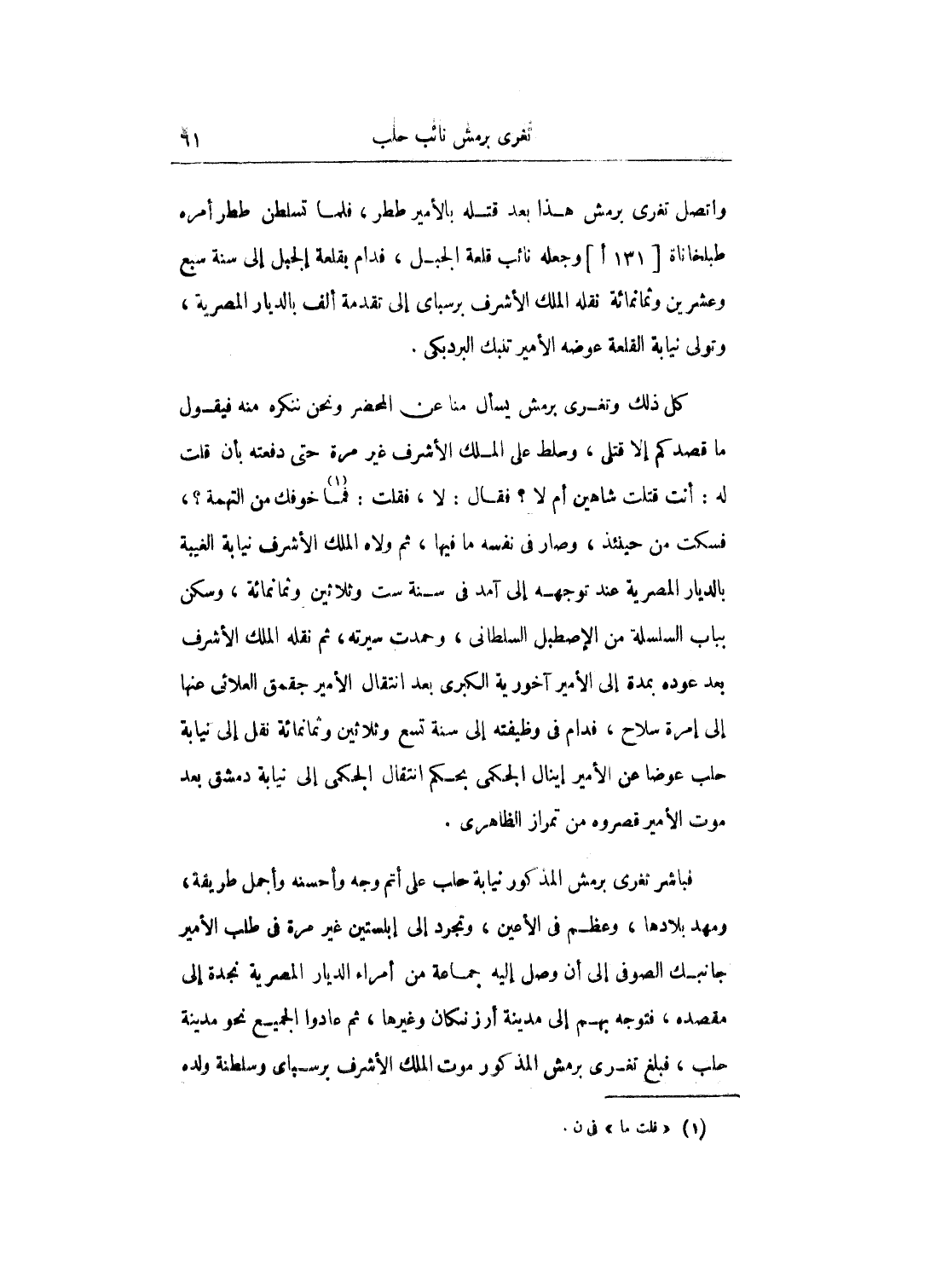 كل ذلك وتغرى برمش يسأل منا عن المحضر ونحن ننكره منه فيقو ما قصدكم إلا قتلى، وسلط على الملك الأشرف غير مرة حتى دفعته بأن قلت له: أنت قتلت شاهين أم لا؟ فقال: لا، فقلت: فما خوفك من التهمة؟، فسكت من حينئذ، وصار في نفسه ما فيها، ثم ولاه الملك الأِشرف نيابة الغيبة بالديار المصرية عند توجهه إلى آمد في سنة ست وثلاثين وثمانمائة، وسكن بباب السلسلة من الإصطبل السلطاني، وحمدت سيرته، ثم نقله الملك الأشرف بعد عوده بمدة إلى الأمير آخورية الكبرى بعد انتقال الأمير جقمق العلائي عنها إلى إمرة سلاح، فدام في وظيفته إلى سنة تسع وثلاثين وثمانمائة نقل إلى نيابة حلب عوضا عن الأمير إينال الجكمى بحكم انتقال الجكمى إلى نيابة دمشق بعد موت الأمير قصروه من تمراز الظاهري.