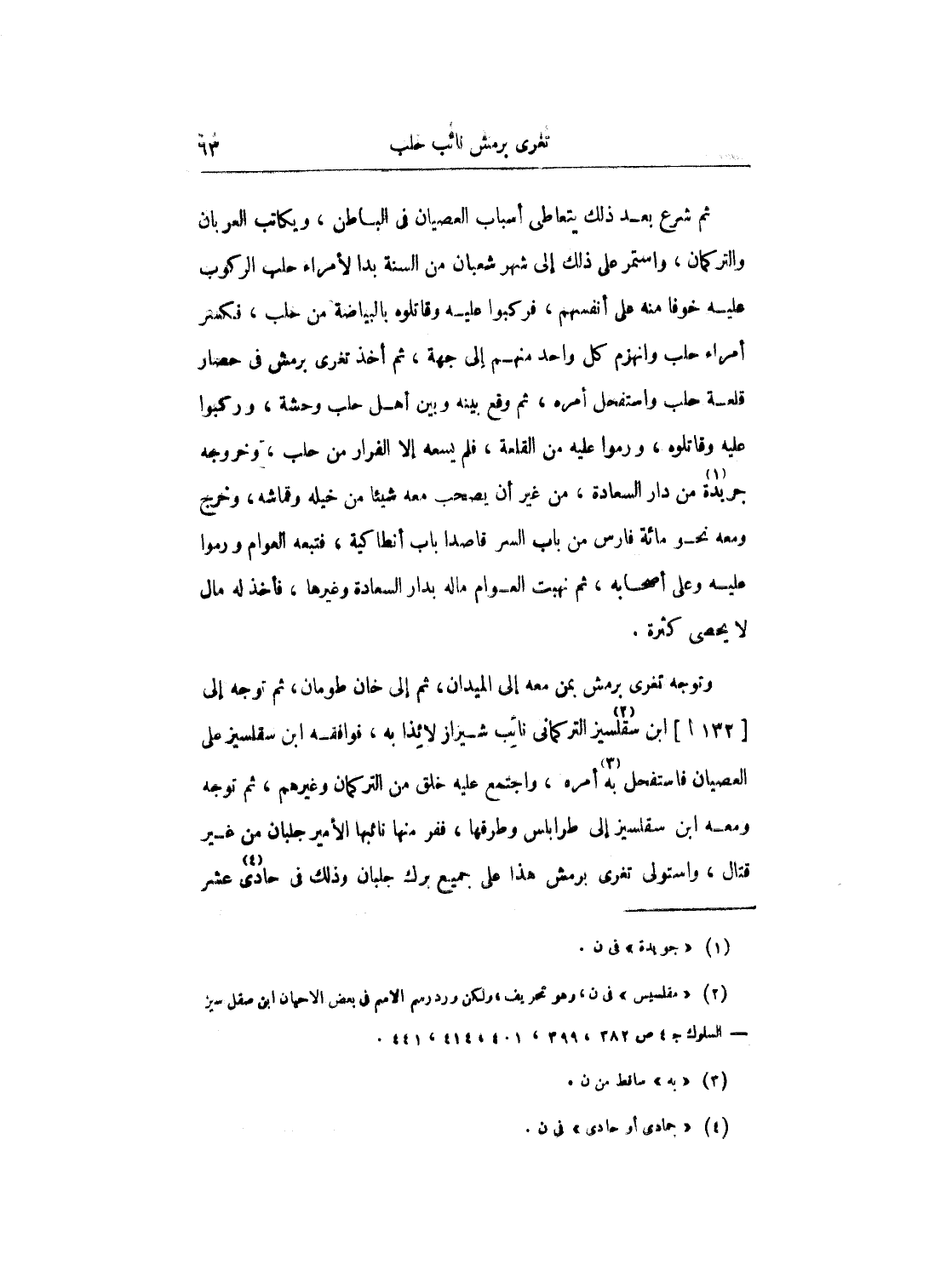 وتوجه ثغرى برمش بمن معه إلى الميدان، ثم إلى خان طومان، ثم توجه إلى ابن سقلسيز التركماني نائب شيراز لا ئذابه، فوافقه ابن سقلسيز على العصيان فاستفحل به أمره، واجتمع عليه خلق من التركمان وغيرهم، ثم توجه ومعه ابن سقلسيز إلى طرابلس وطرقها، ففر منها نائبها الأمير جلبان من غير قتال، واستولى تغرى برمش هذا على جميع برك جلبان وذلك في حادي عشر