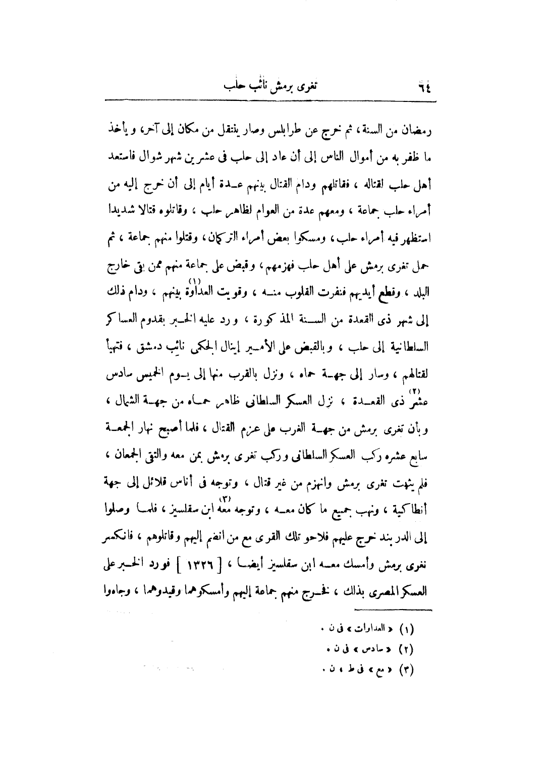 رمضان من السنة، ثم خرج عن طرابلس وصار ينتقل من مكان إلى آخر، ويأخذ ما ظفر به من أموال الناس إلى أن عاد إلى حلب في عشرين شهر شوال فاستعد أهل حلب جماعة، ومعهم عدة من العوام لظاهر حلب، وقاتلوه قتالا شديدا استظهر فيه أمراء حلب، ومسكوا بعض أمراء التركمان، وقتلوا منهم جماعة، ثم حمل تغرى برمش على أهل حلب فهزمهم، وقبض على جماعة منهم ممن بقى خارج البلد، وقطع أيديهم فنفرت القلوب منه، وقويت العداوة بينهم، ودام ذلك إلى شهر ذي القعدة من السنة المذكورة، ورد عليه الخبر بقدوم العساكر السلطانية إلى حلب، وبالقبض على الأمير إينال الجكمى نائب دمشق، فتهيأ لقتالهم، وسار إلى جهة حماه، ونزل بالقرب منها إلى يوم الخميس سادس عشر ذي القعدة، نزل العسكر السلطاني ظاهر حماه من جهة الشمال، وبأن تغرى برمش من جهة الغرب على عزم القتال، فلما أصبح نهار الجمعة سابع عشرة ركب العسكر السلطاني وركب تغرى برمش بمن معه والتقى الجمعان، فلم يثهت تغرى برمش وانهزم من غير قتال، وتوجه في أناس قلائل إلى جهة أنطاكية، ونهب جميع ما كان معه، وتوجه معه ابن سقلسيز، فلما وصلوا إلى الدر بند خرج عليهم فلاحو تلك القرى مع من انضم إليهم وقاتلوهم، فانكسر نغرى برمش وأمسك معه ابن سقلسيز أيضاً، فورد الخبر على العسكر المصري بذلك، فخرج منهم جماعة إليهم وأمسكوهما وقيدوهما، وجاءوا