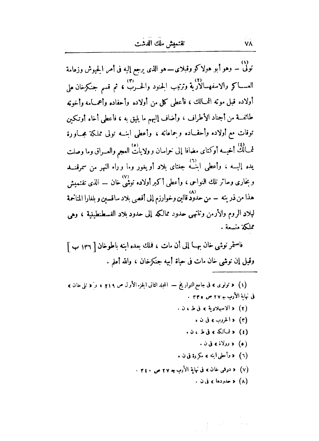 تولى وهو أبو هولاكو وقبلاي - هو الذي يرجع إليه في أمر الجيوش وزعامة العساكر والاسفهسالارية وترتيب الجنود والحرب، ثم قسم جنكرخان على أولاده قبل موته الممالك، فأعطى كل من أولاده وأحفاده وأعمامه وأخوته طائفة من أجناد الأطراف، وأضاف إليهم ما يليق به، فأعطى أخاه أو تكين توقات مع أولاده وأحفاده، وجماعاته، وأعطى ابنه تولى مملكة مجاورة لممالك أخيه أو كتاي مضافاً إلى خراسان وولايات العجم والعراق وما وصلت يده إليه، وأعطى أكبر أولاده توشى خان الذي تقتميش هذا من ذريته من حدود قالين وخوارزم إلى أقصى بلاد ساقسين وبلغارا المتاخمة لبلاد الروم والأرمن وتنتهي حدود ممالكه إلى حدود بلاد القسطنطينية، وهي مملكة متسعة.