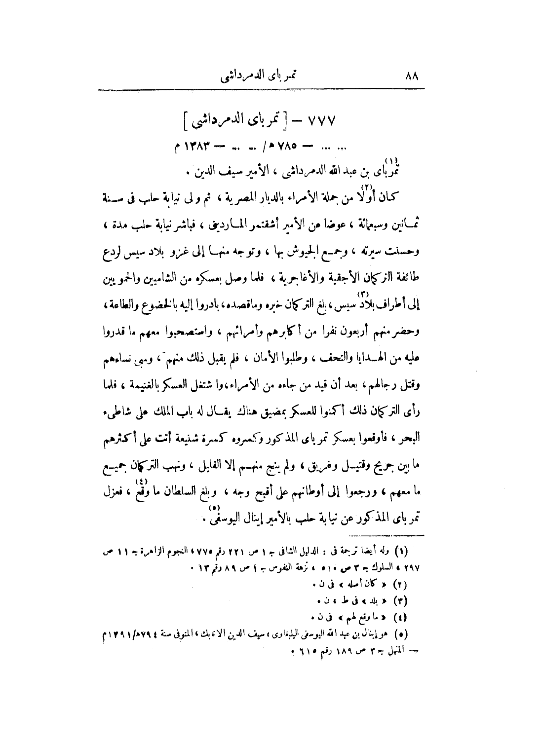 ً من جملة الأمراء بالديار المصرية، ثم ولى نيابة حلب في سنة ثمانين وسبعمائة، عوضاً عن الأمير أشقتمر المارديني، فباشر نيابة حلب مدة، وحسنت سيرته، وجمع الجيوش بها، وتوجه منها إلى غزو بلاد سيس لردع طائفة التركمان الأجقية والأغاجرية، فلما وصل بعسكره من الشاميين والحمويين إلى أطراف بلاد سيس، بلغ التركمان خبره وما قصده، بادروا إليه بالخضوع والطاعة، وحضر منهم أربعون نفراً من أكابرهم وأمرائهم، واستصحبوا معهم ما قدروا عليه من الهدايا والتحف، وطلبوا الأمان، فلم يقبل ذلك منهم، وسبى نساءهم وقتل رجالهم، بعد أن قيد من جاءه من الأمراء، واشتغل العسكر بالغنيمة، فلما رأى التركمان ذلك أكمنوا للعسكر بمضيق هناك يقال له باب الملك على شاطئ البحر، فأوقعوا بعسكر تمرباي المذكور وكسروه كسرة شنيعة أتت على أكثرهم ما بين جريح وقتيل وغريق، ولم ينج منهم إلا القليل، ونهب التركمان جميع ما معهم، ورجعوا إلى أوطانهم على أقبح وجه، وبلغ السلطان ما وقع، فعزل تمرباي المذكور عن نيابة حلب بالأمير إينال اليوسفي.