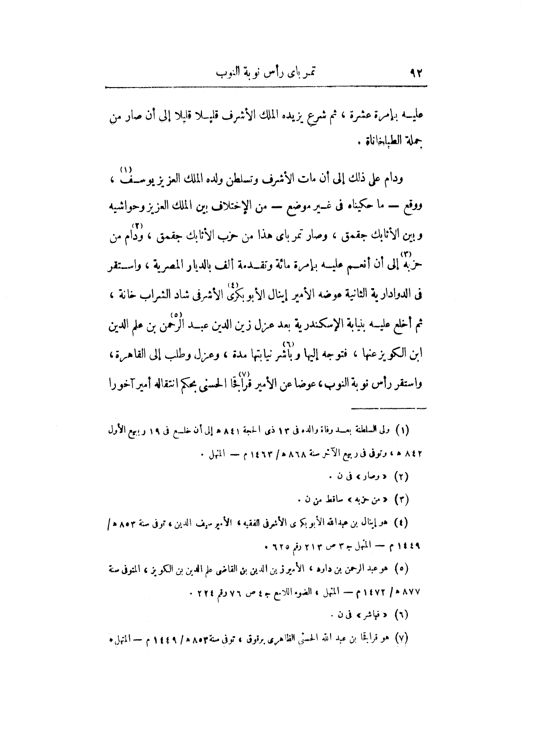 ودام على ذلك إلى أن مات الأشرف وتسلطن ولده الملك العزيز يوسف، ووقع ما حكيناه في غير موضع من الاختلاف بين الملك العزيز وحواشيه وبين الأثابك جقمق، وصار تمر باى هذا من حزب الأثابك جقمق، ودام من حزبه إلى أن أنعم عليه بإمرة مائة وتقدمة ألف بالديار المصرية، واستقر في الدوادارية الثانية عوضه الأمير إينال الأبو بكرى الأشرفي شاد الشراب خانة، ثم أخلع عليه بنيابة الإسكندرية بعد عزل زين الدين عبد الرحمن بن علم الدين ابن الكويز عنها، فتوجه إليها وباشر نيابتها مدة، وعزل وطلب إلى القاهرة، واستقر رأس نوبة النوب، وعوضا عن الأمير قراجا الحسنى بحكم انتقاله أمير آخورا