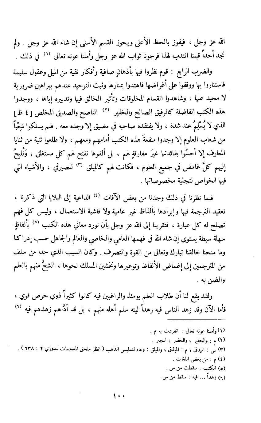 فلما نظرنا في ذلك وجدنا من بعض الآفات (4) الداعية إلى البلايا التي ذكرنا تعقيد الترجمة فيها وإيرادها بألفاظ غير عامية ولا فاشية الاستعمال، وليس كل فهم تصلح له كل عبارة، فتقربنا إلى الله عز وجل بأن نورد معاني هذه الكتب (5) بألفاظٍ سهلة سبطة يستوي إن شاء الله في فهمها العامي والخاصي والعالم والجاهل حسن إدراكنا وما منحنا خالقنا تبارك وتعالى من القوة والتصرف. وكان السبب الذي حدا من سلف من المترجمين إلى إغماض الألفاظ وتوعيرها وتخشين المسلك نحوها، الشح منهم بالعلم والضن به.