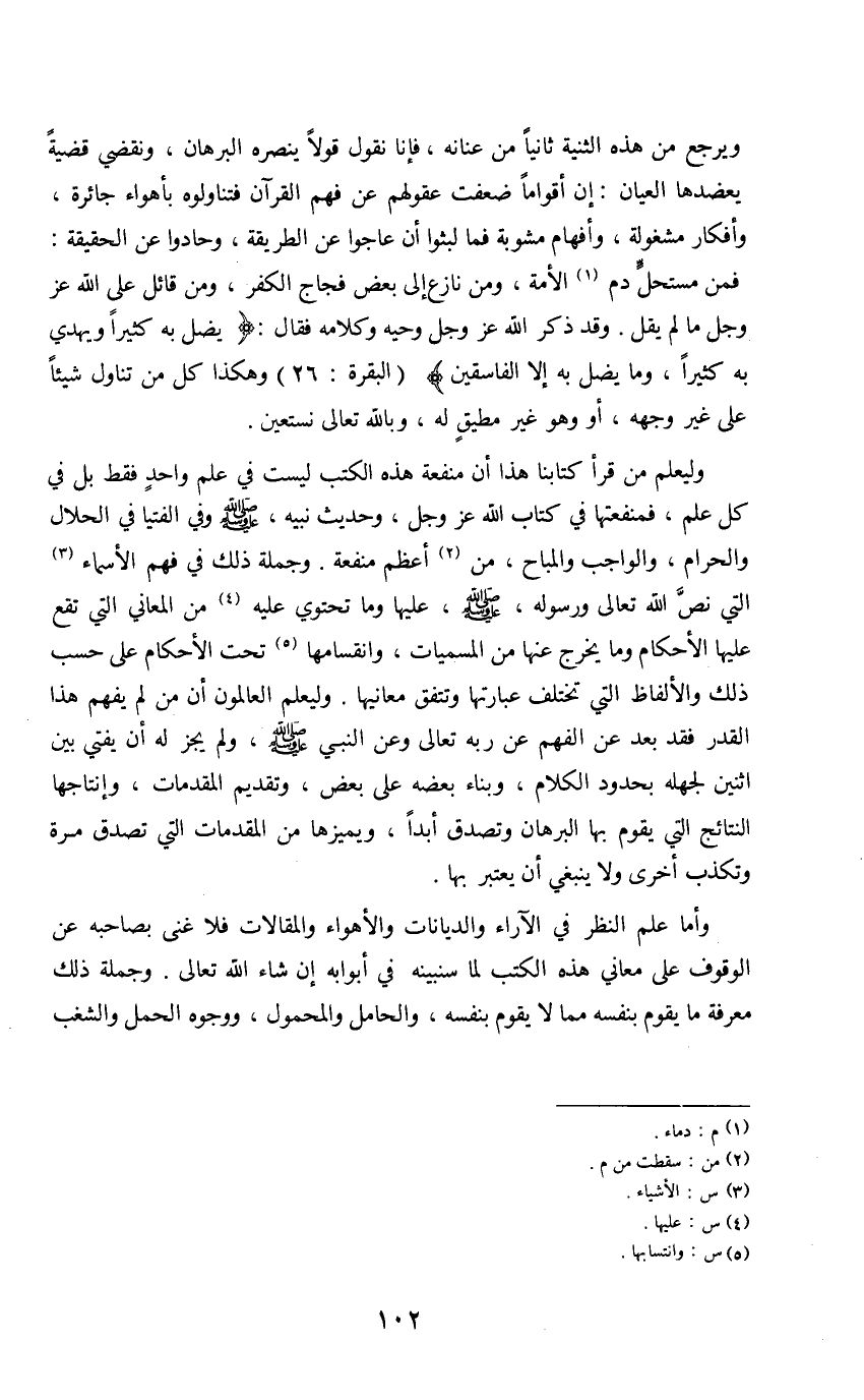 وليعلم من قرأ كتابنا هذا أن منفعة هذه الكتب ليست في علم واحدٍ فقط بل في كل علم، فمنفعتها في كتاب الله عز وجل، وحديث نبيه، صلى الله عليه وسلم وفي الفتيا في الحلالوالحرام، والواجب والمباح، من (2) أعظم منفعة. وجملة ذلك في فهم الأسماء (3) التي نص الله تعالى ورسوله، صلى الله عليه وسلم، عليها وما تحتوي عليه (4) من المعاني التي تقع عليها الأحكام وما يخرج عنها من المسميات، وانقسامها (5) تحت الأحكام على حسب ذلك والألفاظ التي تختلف عباراتها وتتفق معانيها. ولعلم العالمون أن من لم يفهم هذا القدر فقد بعد عن الفهم عن ربه تعالى وعن النبي صلى الله عليه وسلم، ولم يجز له أن يفتي بين اثنين لجهله بحدود الكلام، وبناء بعضه على بعض، وتقديم المقدمات، وإنتاجها النتائج التي يقوم بها البرهان وتصديق أبداً، ويميزها من المقدمات التي تصدق مرة وتكذب أخرى ولا ينبغي أن يعتبر بها.