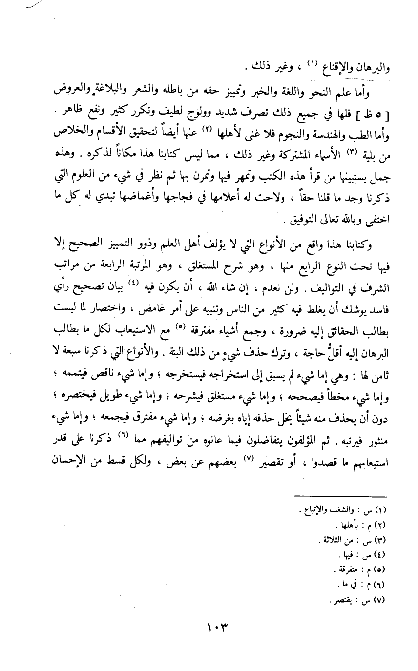 وكتابنا هذا واقع من الأنواع التي لا يؤلف أهل العلم وذوو التمييز الصحيح إلا فيها تحت النوع الرابع منها، وهو شرح المستغلق، وهو المرتبة الرابعة من مراتب الشرف في التواليف. ولن نعدم، إن شاء الله، أن يكون فيه (4) بيان تصحيح رأى فاسد يوشك أن يغلط فيه كثير من الناس وتنبيه على أمر غامض، واختصار لما ليست بطالب الحقائق إليه ضرورة، وجمع أشياء مفترقة (5) مع الاستيعاب لكل ما بطالب البرهان إليه أقل حاجة، وترك حذف شيءٍ من ذلك البتة. والأنواع التي ذكرنا سبعة لا ثامن لها: وهي إما شيء لم يسبق إلى استخراجه فيستخرجه؛ وإما شيء ناقص فيتممه؛ وإما شيء مخطأ فيصححه؛ وإما شيء مستغلق فيشرحه؛ وإما شيء طويل فيختصره؛ دون أن يحذف منه شيئاً يخل حذفه إياه بغرضه؛ وإما شيء مفترق فيجمعه؛ وإما شيء منثور فيرتبه. ثم المؤلفون يتفاضلون فيما عانوه من تواليفهم مما (6) ذكرنا على قدر استيعابهم ما قصدوا، أو تقصير (7) بعضهم عن بعض، ولكل قسط من الإحسان
