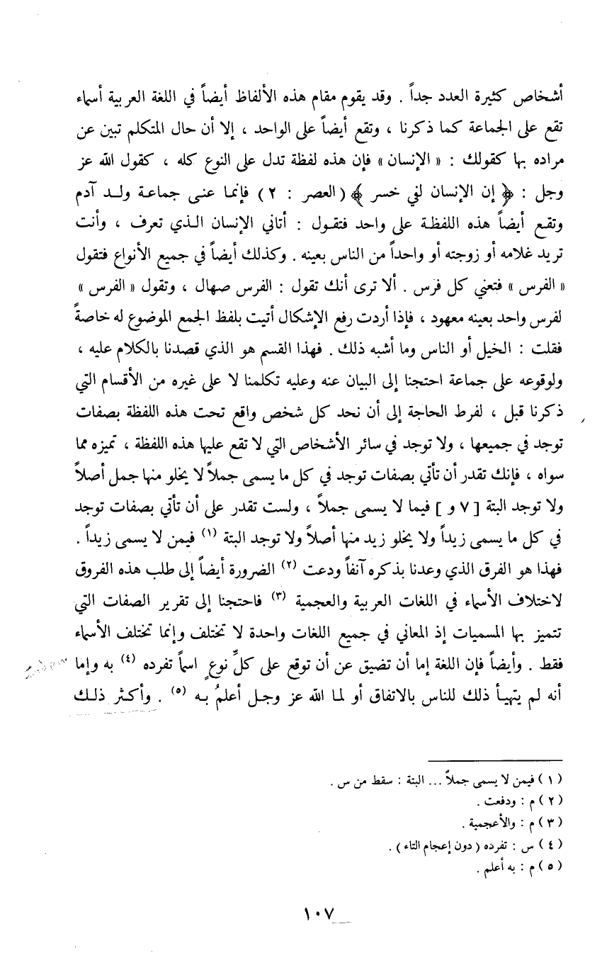أشخاص كثيرة العدد جداً. وقد يقوم مقام هذه الألفاظ أيضاً في اللغة العربية أسماء تقع على الجماعة كما ذكرنا، وتقع أيضاً على الواحد، إلا أن حال المتكلم تبين عن مراده بها كقولك: " الإنسان " فإن هذه لفظة تدل على النوع كله، كقول الله عز وجل: {إن الإنسان لفي خسر} (العصر: 2) فإنما عنى جماعة ولد آدم وتقع أيضاً هذه اللفظة على واحد فتقول: أتاني الإنسان الذي تعرف، وأنت تريد غلامه أو زوجته أو واحداً من الناس بعينه. وكذلك أيضاً في جميع الأنواع فتقول " الفرس " ألا ترى أنك تقول: الفرس صهال، وتقول " الفرس " لفرس واحد بعينه معهود، فإذا أردت رفع الإشكال أتيت بلفظ الجمع الموضوع له خاصةً فقلت: الخيل أو الناس وما أشبه ذلك. فهذا القسم هو الذي قصدنا بالكلام عليه، ولوقوعه على جماعة احتجنا إلى البيان عنه وعليه تكلمنا لا على غيره من الأقسام التي ذكرنا قبل، لفرط الحاجة إلى أن نحد كل شخص واقع تحت هذه اللفظة بصفات توجد في جميعها، ولا توجد في سائر الأشخاص التي لا تقع عليها هذه اللفظة، تميزه مما سواه، فإنك تقدر أن تأتي بصفات توجد في كل ما يسمى جملاً لا يخلو منها جمل أصلاً ولا توجد البتة [7 و] فيما لا يسمى جملاً، ولست تقدر على أن تأتي بصفات توجد في كل ما يسمى زيداً ولا يخلو زيد منها أصلاً ولا توجد البتة (1) فيمن لا يسمى زيداً. فهذا هو الفرق الذي وعدنا بذكره آنفاً ودعت (2) الضرورة أيضاً إلى طلب هذه الفروق لاختلاف الأسماء في اللغات العربية والعجمية (3) فاحتجنا إلى تقرير الصفات التي تتميز بها المسميات إذ المعاني في جميع اللغات واحدة لا تختلف وإنما تختلف الأسماء فقط. وأيضاً فإن اللغة إما أن تضيق عن أن توقع على كل نوع اسماً تفرده (4) به. وإما أنه لم يتهيأ ذلك للناس بالاتفاق أو لما الله عز وجل أعلم به (5) . وأكثر ذلك