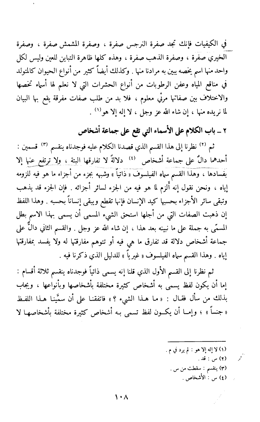 ثم (2) نظرنا إلى هذا القسم الذي قصدنا الكلام عليه فوجدناه ينقسم (3) قسمين: أحدهما دال على جماعة أشخاص (4) دلالةً لا تفارقها البتة، ولا ترتفع عنها إلا يفسادها، وهذا القسم سماه الفيلسوف " ذاتياً " وشبهه بجزء من أجزاء ما هو فيه للزومه إياه، ونحن نقول إنه الزم لما هو فيه من الجزء لسائر أجزائه. فإن الجزء قد يذهب وتبقى سائر الأجزاء بحسبها كيد الإنسان فإنها تقطع ويبقى إنساناً بحسبه. وهذا اللفظ إن ذهبت الصفات التي من أجلها استحق الشيء المسمى أن يسمى بهذا الاسم بطل المسمى به جملة على ما نبينه بعد هذا، إن شاء الله عز وجل. والقسم الثاني دال على جماعة أشخاص دلالة قد تفارق ما هي فيه أو تتوهم مفارقتها له ولا يفسد بمفارقتها إياه. وهذا القسم سماه الفيلسوف " غيرياً " للدليل الذي ذكرنا فيه.
