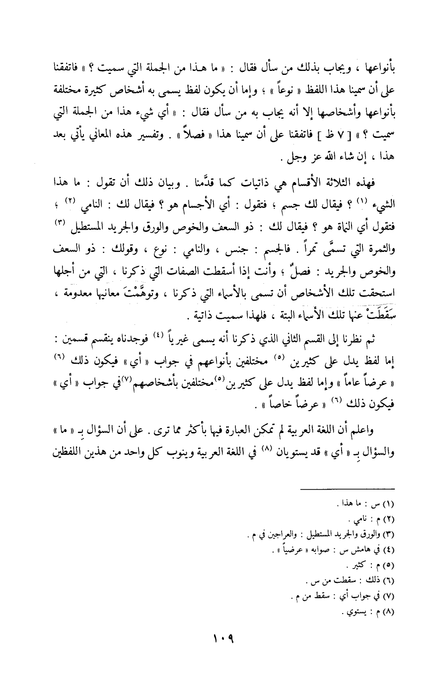 واعلم أن اللغة العربية لم تمكن العبارة فيها بأكثر مما ترى. على أن السؤال ب " ما " والسؤال ب " أي " قد يستويان (8) في اللغة العربية وينوب كل واحد من هذين اللفظين