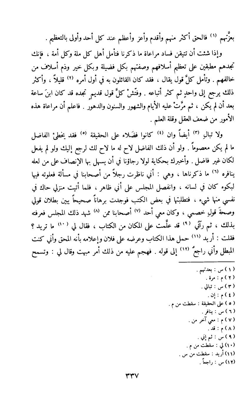 ولا تبال (3) أيضا وان (4) كانوا فضلاء على الحقيقة (5) فقد يخطئ الفاضل ما لم يكن معصوما. ولو أن ذلك الفاضل لاح له ما لاح لك لرجع إليك ولو لم يفعل لكان غير فاضل. وأخبرك بحكاية لولا رجاؤنا في أن يسهل بها الإنصاف على من لعله ينافره (6) ما ذكرناه، وهي: أني ناظرت رجلا من أصحابنا في مسألة فعلوته فيها لبكوء كان في لسانه، وانفصل المجلس على أني ظاهر، فلما أتيت منزلي حاك في نفسي منها شيء، فتطلبتها في بعض الكتب فوجدت برهانا صحيحا يبين بطلان قولي وصحة قول خصمي، وكان معي أحد (7) أصحابنا ممن (8) شهد ذلك المجلس فعرفته بذلك، ثم رآني (9) قد علمت على المكان من الكتاب، فقال لي (10) ما تريد فقلت: أريد (11) حمل هذا الكتاب وعرضه على فلان وإعلامه بأنه المحق وأني كنت المبطل وأني راجع (12) إلى قوله. فهجم عليه من ذلك أمر مبهت وقال لي: وتسمح