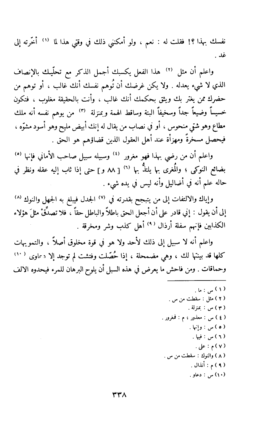 واعلم أن مثل (2) هذا الفعل يكسبك أجمل الذكر مع تحليك بالإنصاف الذي لا شيء يعدله. ولا يكن غرضك أن توهم نفسك أنك غالب، أو توهم من حضرك ممن يغتر بك ويثق بحكمك أنك غالب، وأنت بالحقيقة مغلوب، فتكون خسيسا وضيعا جدا وسخيفا البتة وساقط الهمة وبمنزلة (3) من يوهم نفسه أنه ملك مطاع وهو شقي منحوس، أو في نصاب من يقال له إنك أبيض مليح وهو أسود مشوه، فيحصل مسخرة ومهزأة عند أهل العقول الذين قضاؤهم هو الحق.