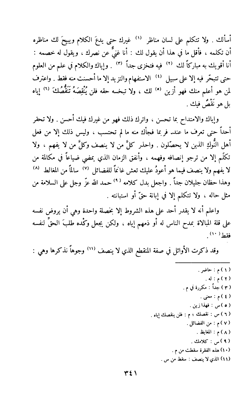 وإياك والامتداح بما تحسن، واترك ذلك فهو من غيرك فيك أحسن، ولا تحقر أحدا حتى تعرف ما عنده فربما فجأك منه ما لم تحتسب، وليس ذلك إلا من فعل أهل النوك الذين لا يحصلون. واحذر كل من لا ينصف وكل من لا يفهم، ولا تكلم إلا من ترجو إنصافه وفهمه، وأنفق الزمان الذي يمضي ضياعا في مكالمة من لا يفهم ولا ينصف فيما هو أعود عليك تعش غانما للفضائل (7) سالما من المغالط (8) وهذا حظان جليلان جدا. واجعل بدل كلامه (9) حمد الله عز وجل على السلامة من مثل حاله، ولا تتكلم إلا في إبانة حق أو استبانتة.