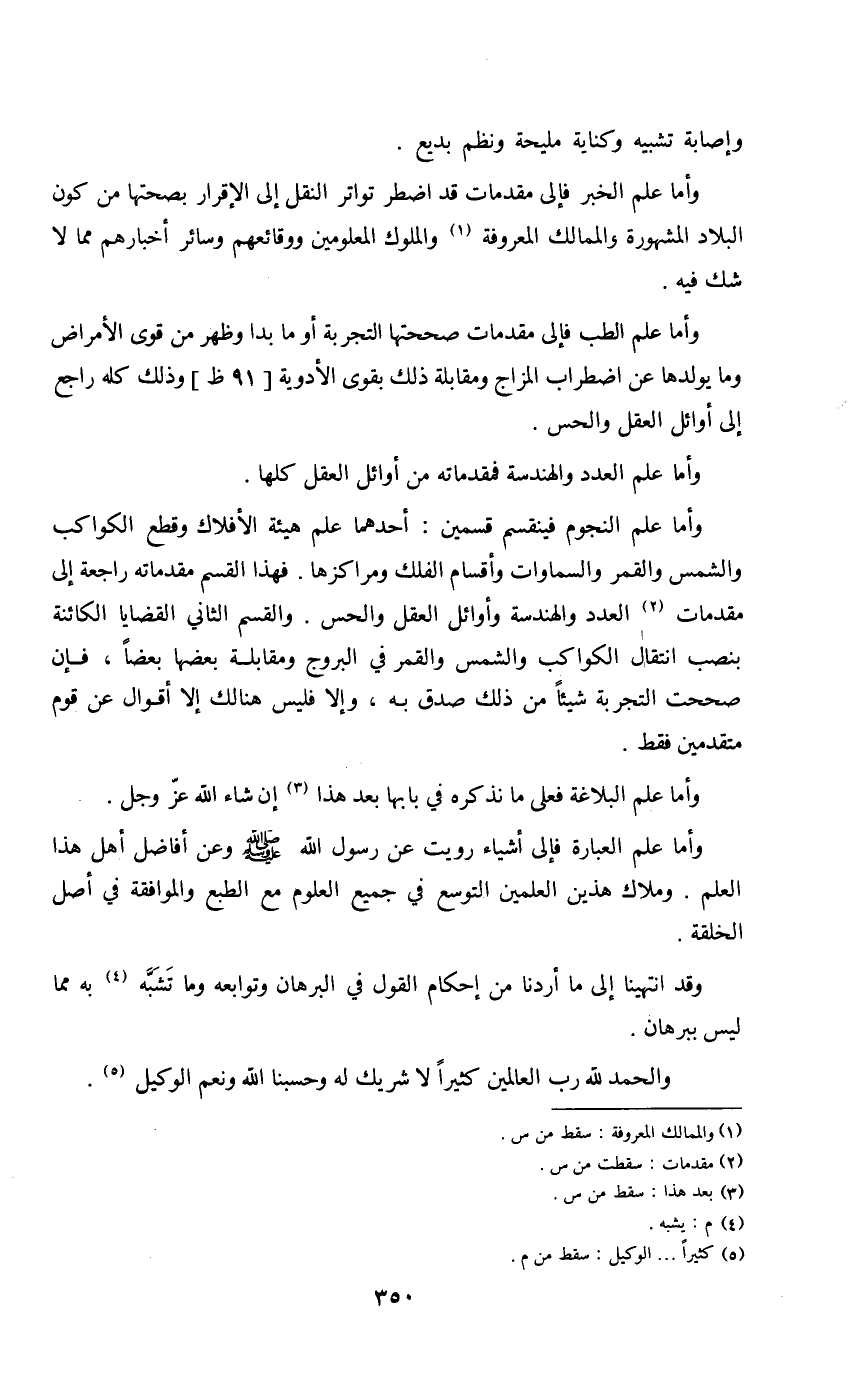 وأما علم الطب فإلى مقدمات صححتها التجربة أو ما بدا وظهر من قوى الأمراض وما يولدها عن اضطراب المزاج ومقابلة ذلك بقوى الأدوية [91ظ] وذلك كله راجع إلى أوائل العقل والحس.