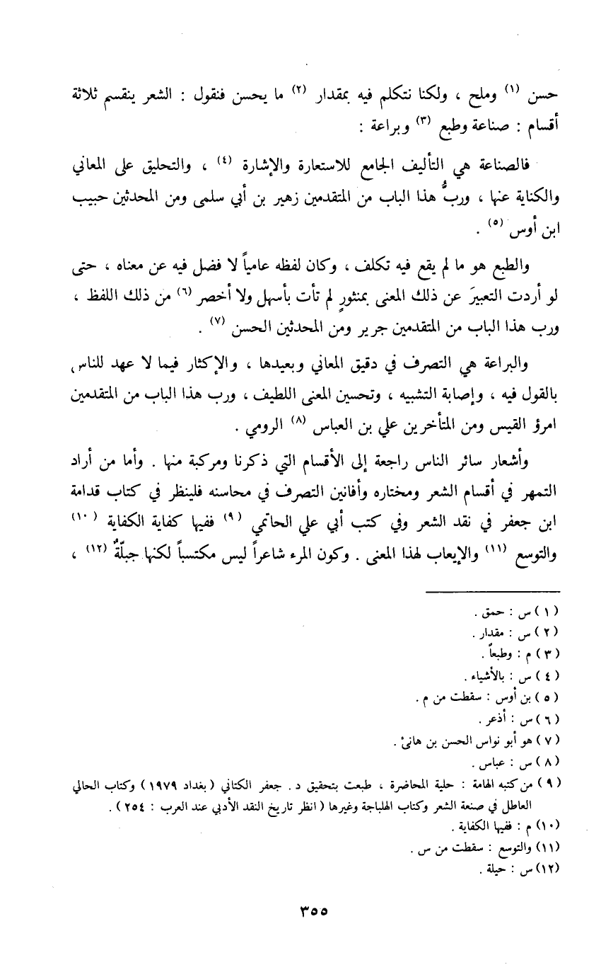 وأشعار سائر الناس راجعة إلى الأقسام التي ذكرنا ومركبة منها. وأما من أراد التمهر في أقسام الشعر ومختاره وأفانين التصرف في محاسنه فلينظر في كتاب قدامة ابن جعفر في نقد الشعر وفي كتب أبي عليّ الحاتمي (9) ففيها كفاية الكفاية (10) والتوسع (11) والإيعاب لهذا المعنى. وكون المرء شاعرا ليس مكتسبا لكنها جبلة (12) ،