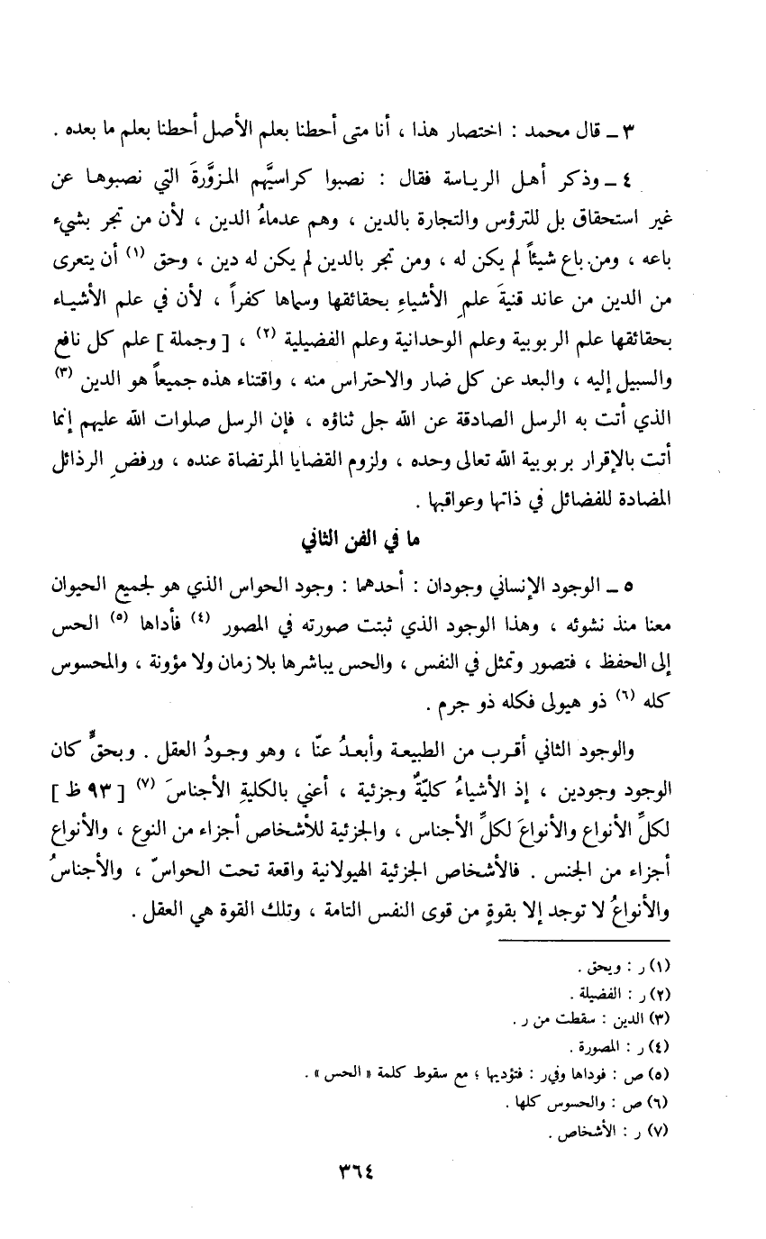 5 - الوجود الإنساني وجودان: أحدهما: وجود الحواس الذي هو لجميع الحيوان معنا منذ نشوئه، وهذا الوجود الذي ثبتت صورته في المصور (4) فأداها (5) الحس إلى الحفظ، فتصور وتمثل في النفس، والحس يباشرها بلا زمان ولا مؤونة، والمحسوس كله (6) ذو هيولى فكله ذو جرم.