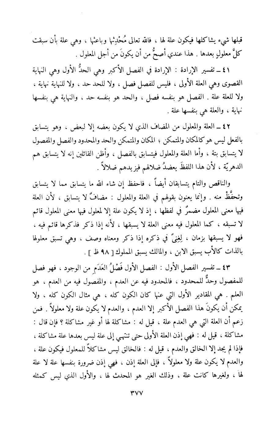 42 - العلة والمعلول من المضاف الذي لا يكون بعضه إلا لبعض، وهو يتسابق بالفعل ليس هو كالمكان والمتمكن؛ المكان والمتمكن والحد والمحدود والفصل والمفصول لا يتسابق بتة، وأما العلة والمعلول فيتسابق بالفصل، وأظن القائلين إنه لا يتسابق هم الدهرية، لأن هذا اللفظ يعضد ضلالهم فيزيدهم ضلالا.
