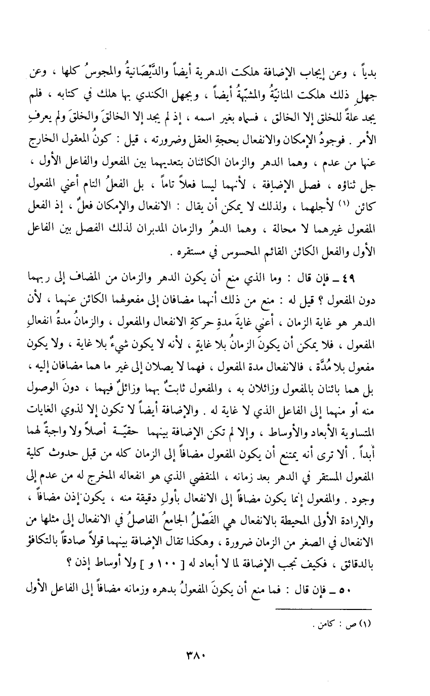 49 - فإن قال: وما الذي منع أن يكون الدهر والزمان من المضاف إلى ربهما دون المفعول قيل له: منع من ذلك أنهما مضافان إلى مفعولهما الكائن عنهما، لأن الدهر هو غاية الزمان، أعني غاية مدة حركة الانفعال والمفعول، والزمان مدة انفعال المفعول، فلا يمكن أن يكون الزمان بلا غاية، لأنه لا يكون شيء بلا غاية، ولا يكون مفعول بلا مدة، فالانفعال مدة المفعول، فهما لا يصلان إلى غير ما هما مضافان إليه، بل هما بائنان بالمفعول وزائلان به، والمفعول ثابت بهما وزائل فيهما، دون الوصول منه أو منهما إلى الفاعل الذي لا غاية له. والإضافة أيضا لا تكون إلا لذوي الغايات المتساوية الأبعاد والأوساط، وإلا لم تكن الإضافة بينهما حقيقة أصلا ولا واجبة لهما أبدا. ألا ترى أنه يمتنع أن يكون المفعول مضافا إلى الزمان كله من قبل حدوث كلية المفعول المستقر في الدهر بعد زمانه، المقضي الذي هو انفعاله المخرج له من عدم إلى وجود. والمفعول إنما يكون مضافا إلى الانفعال بأول دقيقة منه، يكون إذن مضافا، والإرادة الأولى المحيطة بالانفعال هي الفصل الجامع الفاصل في الانفعال إلى مثلها من الانفعال في الصغر من الزمان ضرورة، وهكذا تقال الإضافة بينهما قولا صادقا بالتكافؤ بالدقائق، فكيف تجب الإضافة لما لا أبعاد له [100و] ولا أوساط إذن
