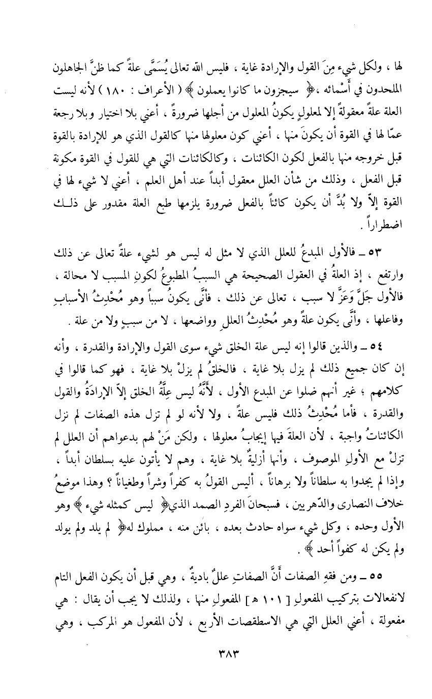 53 - فالأول المبدع للعلل الذي لا مثل له ليس هو لشيء علة تعالى عن ذلك وارتفع، إذ العلة في العقول الصحيحة هي السبب المطبوع لكون المسبب لا محالة، فالأول جل وعز لا سبب، تعالى عن ذلك، فأنى يكون سببا وهو محدث الأسباب وفاعلها، وأنى يكون علة وهو محدث العلل وواضعها، لا من سبب ولا من علة.