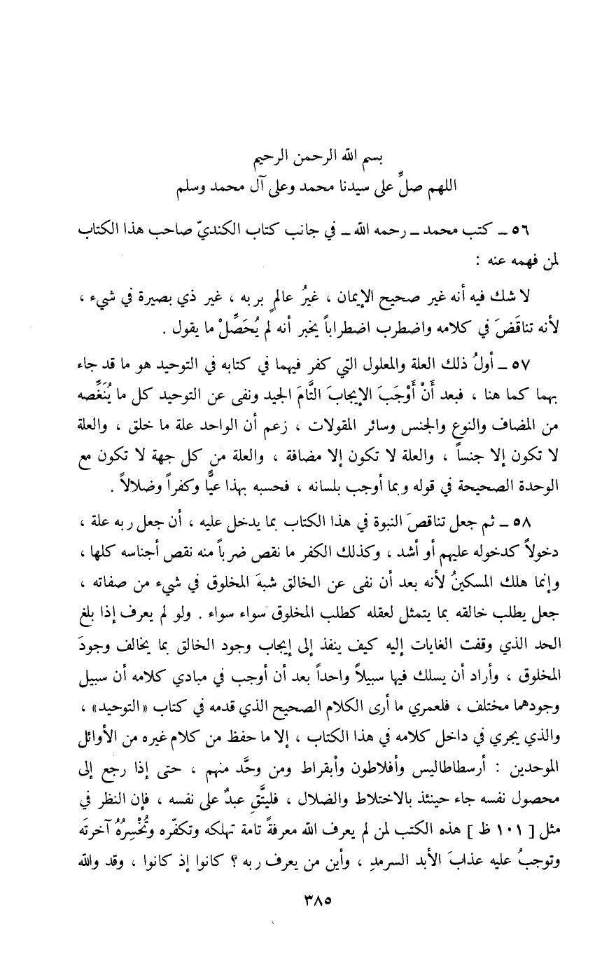56 - كتب محمد - رحمه الله - في جانب كتاب الكندي صاحب هذا الكتاب لمن فهمه عنه: