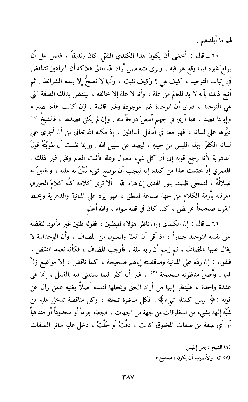 60 - قال: أخشى أن يكون هذا الكندي الشقي كان زنديقا، فعمل على أن يوقع غيره فيما وقع هو فيه، ويرى مثله ممن أراد الله تعالى هلاكه أن البراهين تتناقض في إثبات التوحيد، كيف هي وكيف تثبت، وأنها لا تصح إلا بهذه الشرائط. ثم أتبع ذلك بأنه لابد للعالم من علة، وأنه لا علة إلا خالقه، لينقض بذلك الصفة التي هي التوحيد، فيرى أن الوحدة غير موجودة وغير قائمة. فإن كانت هذه بصيرته وإياها قصد، فما أرى في جهنم أسفل درجة منه. وإن لم يكن قصدها، فالشيخ (1) دبرها على لسانه، فهو معه في أسفل السافلين، إذ مكنه الله تعالى من أن أجرى على لسانه الكفر بهذا اللبس من حيله، ليصد عن سبيل الله. وربما ظننت أن طويته قول الدهرية لأنه رجع قوله إلى أن كل شيء معلول وعلة فأثبت العالم ونفى غير ذلك. فلعمري إذ خشيت هذا من كيده إنه ليجب أن يوضع شيء يبين به عليه، ويقابل به ضلاله، لتمحى ظلمته بنور الهدى إن شاء الله. ألا ترى كلامه كله كلام الحيران معرفته بأزمة الكلام من جهة صناعة المنطق، فهو يرد على المنانية والدهرية ويخلط القول صحيحا بمريض، كما كان في قلبه سواء، والله أعلم.