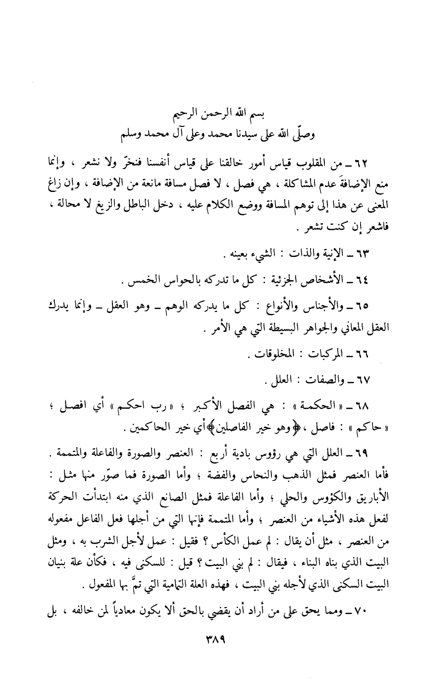 69 - العلل التي هي رؤوس بادية أربع: العنصر والصورة والفاعلة والمتممة. فأما العنصر فمثل الذهب والنحاس والفضة؛ وأما الصورة فما صور منها مثل: الأباريق والكؤوس والحلي؛ وأما الفاعلة فمثل الصانع الذي منه ابتدأت الحركة لفعل هذه الأشياء من العنصر؛ وأما المتممة فإنها التي من أجلها فعل الفاعل مفعوله من العنصر، مثل أن يقال: لم عمل الكأس فقيل: عمل لأجل الشرب به، ومثل البيت الذي بناه البناء، فيقال: لم بني البيت قيل: للسكنى فيه، فكأن علة بنيان البيت السكنى الذي لأجله بني البيت، فهذه العلة التمامية التي تم بها المفعول.