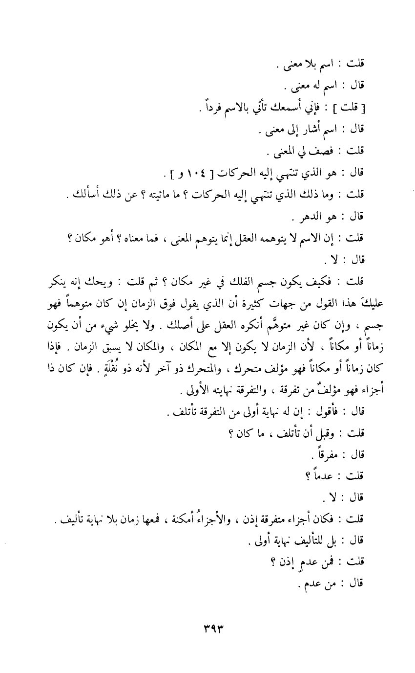 قلت: فكيف يكون جسم الفلك في غير مكان ثم قلت: ويحك إنه ينكر عليك هذا القول من جهات كثيرة أن الذي يقول فوق الزمان إن كان متوهما فهو جسم، وإن كان غير متوهم أنكره العقل على أصلك. ولا يخلو شيء من أن يكون زمانا أو مكانا، لأن الزمان لا يكون إلا مع المكان، والمكان لا يسبق الزمان. فإذا كان زمانا أو مكانا فهو مؤلف متحرك، والمتحرك ذو آخر لأنه ذو نقلة. فإن كان ذا أجزاء فهو مؤلف من تفرقة، والتفرقة نهايته الأولى.