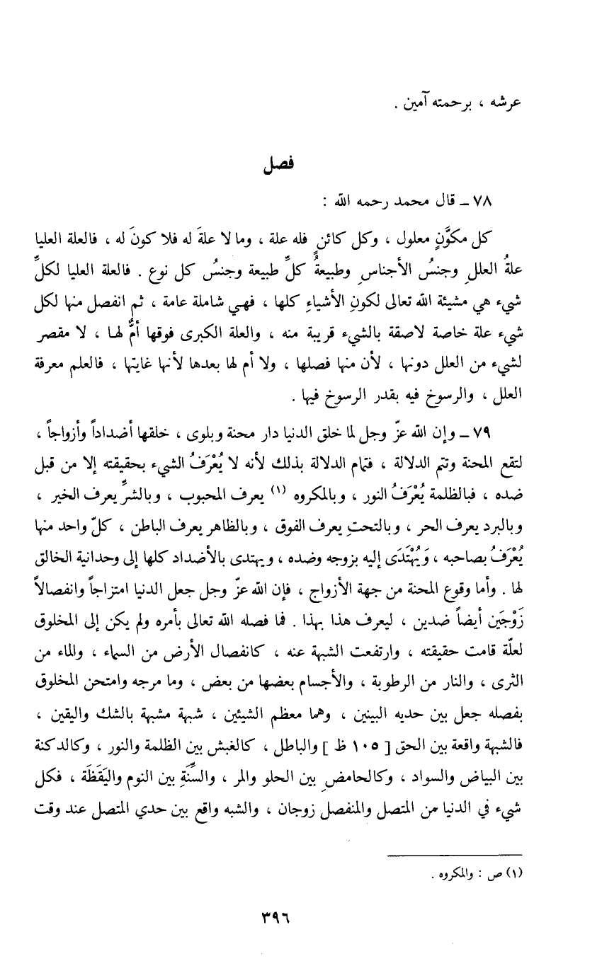 كل مكون معلول، وكل كائن فله علة، وما لا علة له فلا كون له، فالعلة العليا علة العلل وجنس الأجناس وطبيعة كل طبيعة وجنس كل نوع. فالعلة العليا لكل شيء هي مشيئة الله تعالى لكون الأشياء كلها، فهي شاملة عامة، ثم انفصل منها لكل شيء علة خاصة لاصقة بالشيء قريبة منه، والعلة الكبرى فوقها أم لها، لا مقصر لشيء من العلل دونها، لأن منها فصلها، ولا أم لها بعدها لأنها غايتها، فالعلم معرفة العلل، والرسوخ فيه بقدر الرسوخ فيها.