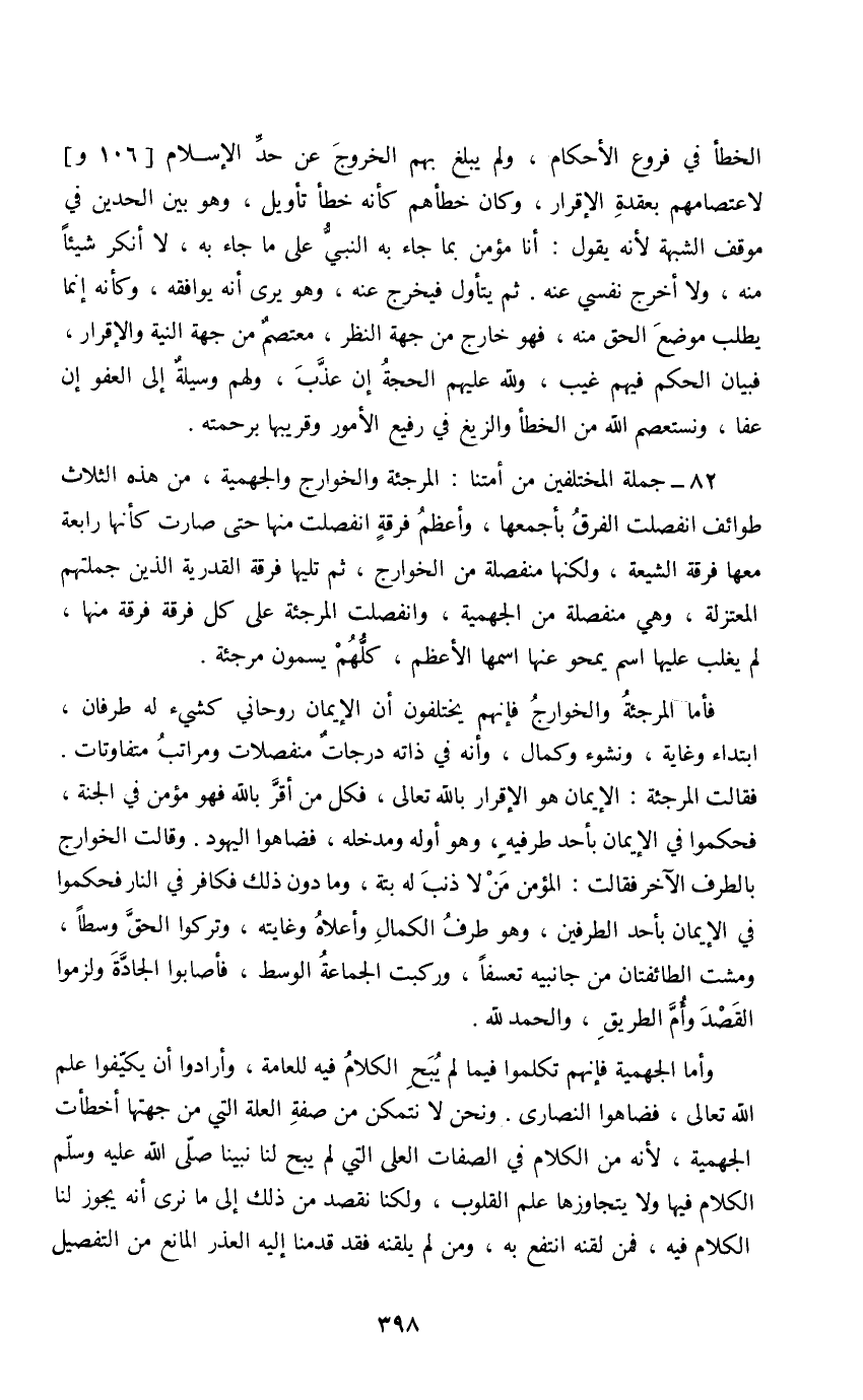 82 - جملة المختلفين من أمتنا: المرجئة والخوارج والجهمية، من هذه الثلاث طوائف انفصلت الفرق بأجمعها، وأعظم فرقة انفصلت منها حتى صارت كأنها رابعة معها فرقة الشيعة، ولكنها منفصلة من الخوارج، ثم تليها فرقة القدرية الذين جملتهم المعتزلة، وهي منفصلة من الجهمية، وانفصلت المرجئة على كل فرقة فرقة منها، لم يغلب عليها اسم يمحو عنها اسمها الأعظم، كلهم يسمون مرجئة.