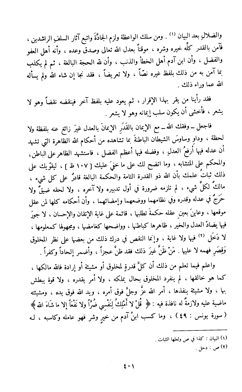 والضلال بعد البيان (1) . ومن سلك الواعظة ولزم الجادة واتبع آثار السلف الراشدين، فآمن بالقدر كله خيره وشره، موقنا بعدل الله تعالى وصدق وعده، وأنه أهل العفو والفضل، وأن ابن أدم أهل الخطأ والذنب، وأن لله الحجة البالغة، ثم لم يكذب بما آمن به من ذلك بلفظ غيره نصا، ولا تعريضا، فقد نجا إن شاء الله ولم يسأله الله عما وراء ذلك.