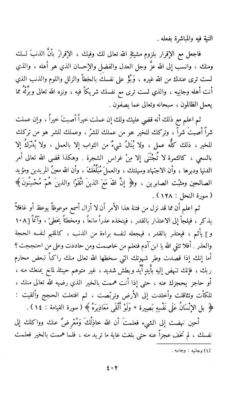 ثم اعلم مع ذلك أنه قضي عليك ولك إن عملت خيرا أصبت خيرا، وإن عملت شرا أصبت شرا، وتركك للخير هو من عملك للشر، وعملك للشر هو من تركك للخير، ذلك كله عمل، ولا ينال شيء من الثواب إلا بالعمل، ولا يدرك إلا بالسعي، كالثمرة لا تجتنى إلا من غراس الشجرة. وهكذا قضى الله تعالى أمر الدنيا ودبرها، وأن الاجتهاد وسيلتك، والعمل مبلغك، وأن الله معين المريدين ومؤيد الصالحين ومثبت الصابرين، {إن الله مع الذين اتقوا والذين هم محسنون} (سورة النحل: 128) .