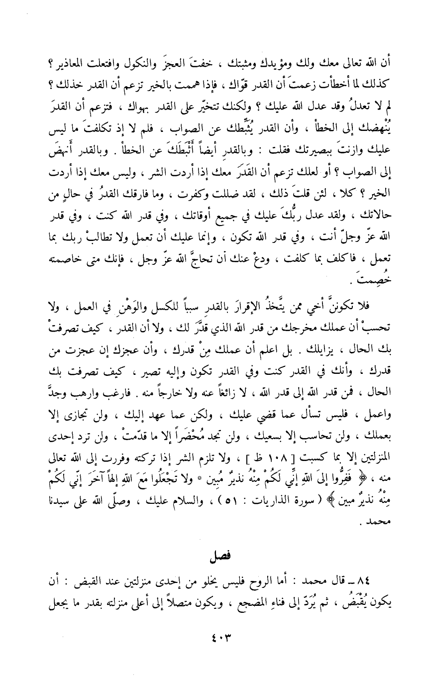 فلا تكون أخي ممن يتخذ الإقرار بالقدر سببا للكسل والوهن في العمل، ولا تحسب أن عملك مخرجك من قدر الله الذي قدر لك، ولا أن القدر، كيف تصرفت بك الحال، يزايلك. بل اعلم أن عملك من قدرك، وأن عجزك إن عجزت من قدرك، وأنك في القدر كنت وفي القدر تكون وإليه تصير، كيف تصرفت بك الحال، فمن قدر الله إلى قدر الله، لا زائغا عنه ولا خارجا منه. فارغب وارهب وجد واعمل، فليس تسأل عما قضي عليك، ولكن عما عهد إليك، ولن تجازى إلا بعملك، ولن تحاسب إلا بسعيك، ولن تجد محضرا إلا ما قدمت، ولن ترد إحدى المنزلتين إلا بما كسبت [108ظ] ، ولا تلزم الشر إذا تركته وفررت إلى الله تعالىمنه، {ففروا إلى الله إنى لكم منه نذير مبين. ولا تجعلوا مع الله إلها آخر إني لكم منه نذير مبين} (سورة الذاريات: 51) ، والسلام عليك، وصلى الله على سيدنا محمد.