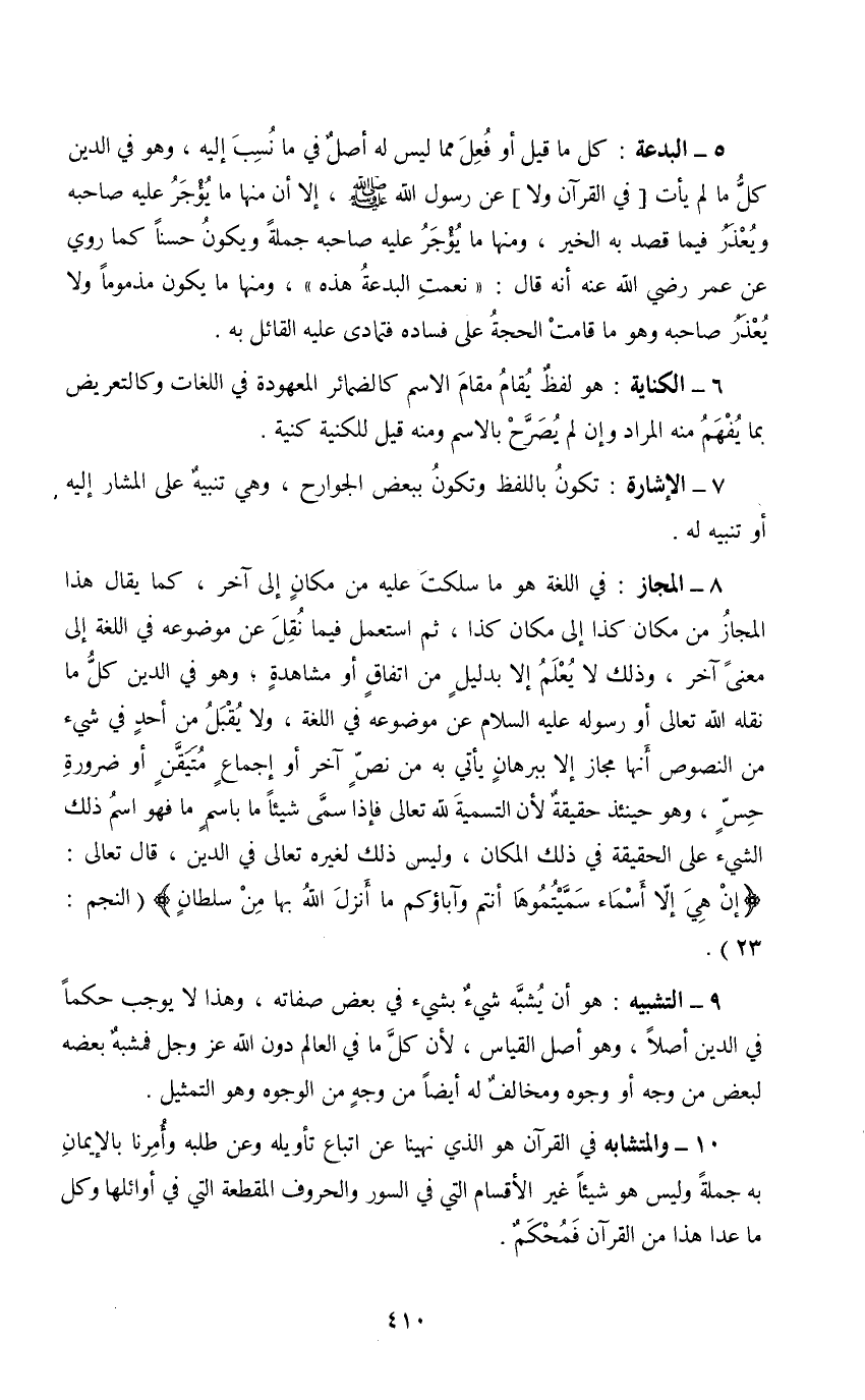 9 - التشبيه: هو أن يشبه شيء بشيء في بعض صفاته، وهذا لا يوجب حكما في الدين أصلا، وهو أصل القياس، لأن كل ما في العالم دون الله عز وجل فمشبه بعضه لبعض من وجه أو وجوه ومخالف له أيضا من وجه من الوجوه وهو التمثيل.
