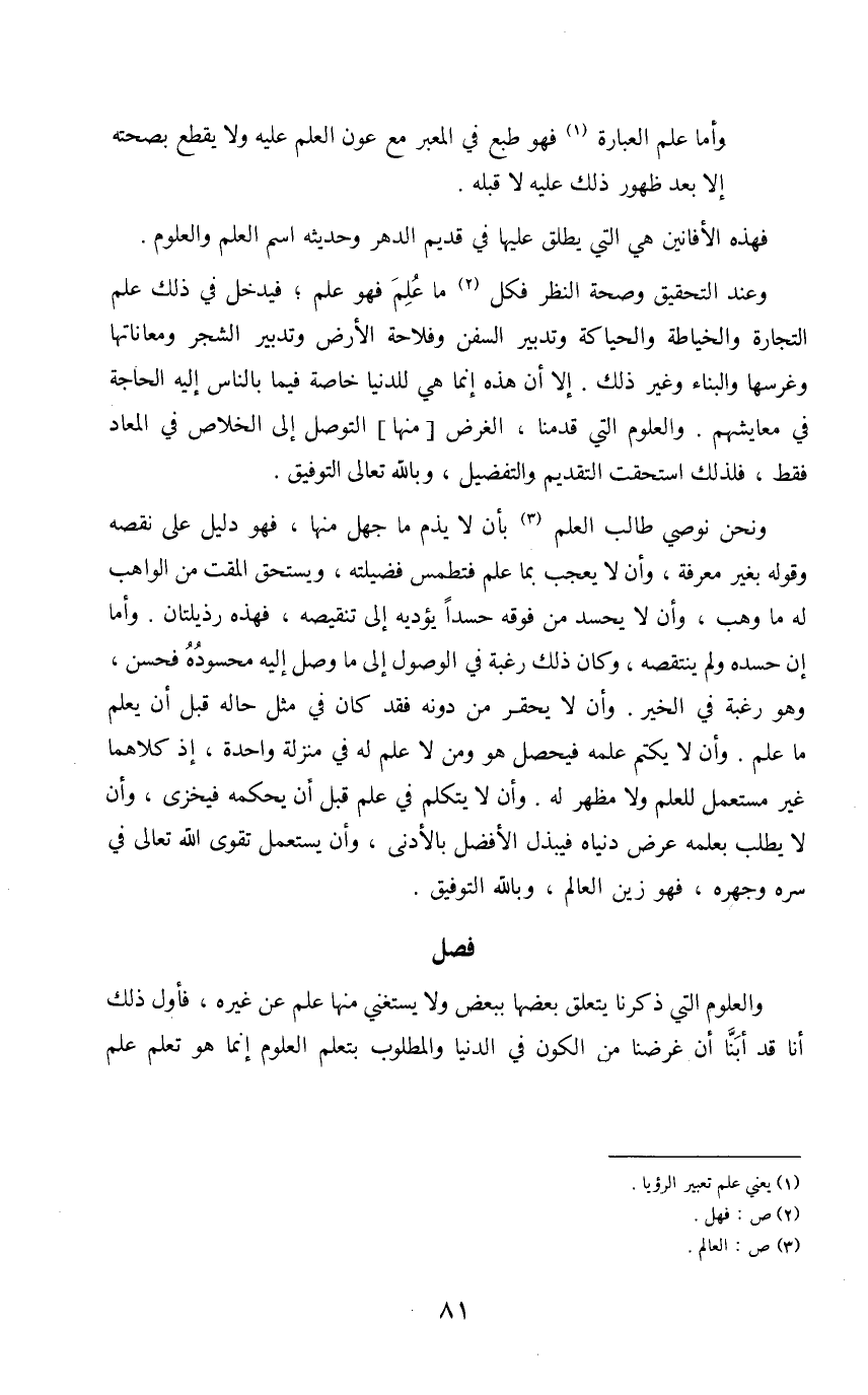 وعند التحقيق وصحة النظر فكل (2) ما علم فهو علم؛ فيدخل في ذلك علم التجارة والخياطة والحياكة وتدبير السفن وفلاة الأرض وتدبير الشجر ومعاناتها وغرسها والبناء وغير ذلك. إلا أن هذه إنما هي للدنيا خاصة فيما بالناس إليه الحاجة في معايشهم. والعلوم التي قدمنا، الغرض [منها] التوصل إلى الخلاص في المعاد فقط، فلذلك استحقت التقديم والتفضيل، والله تعالى التوفيق.