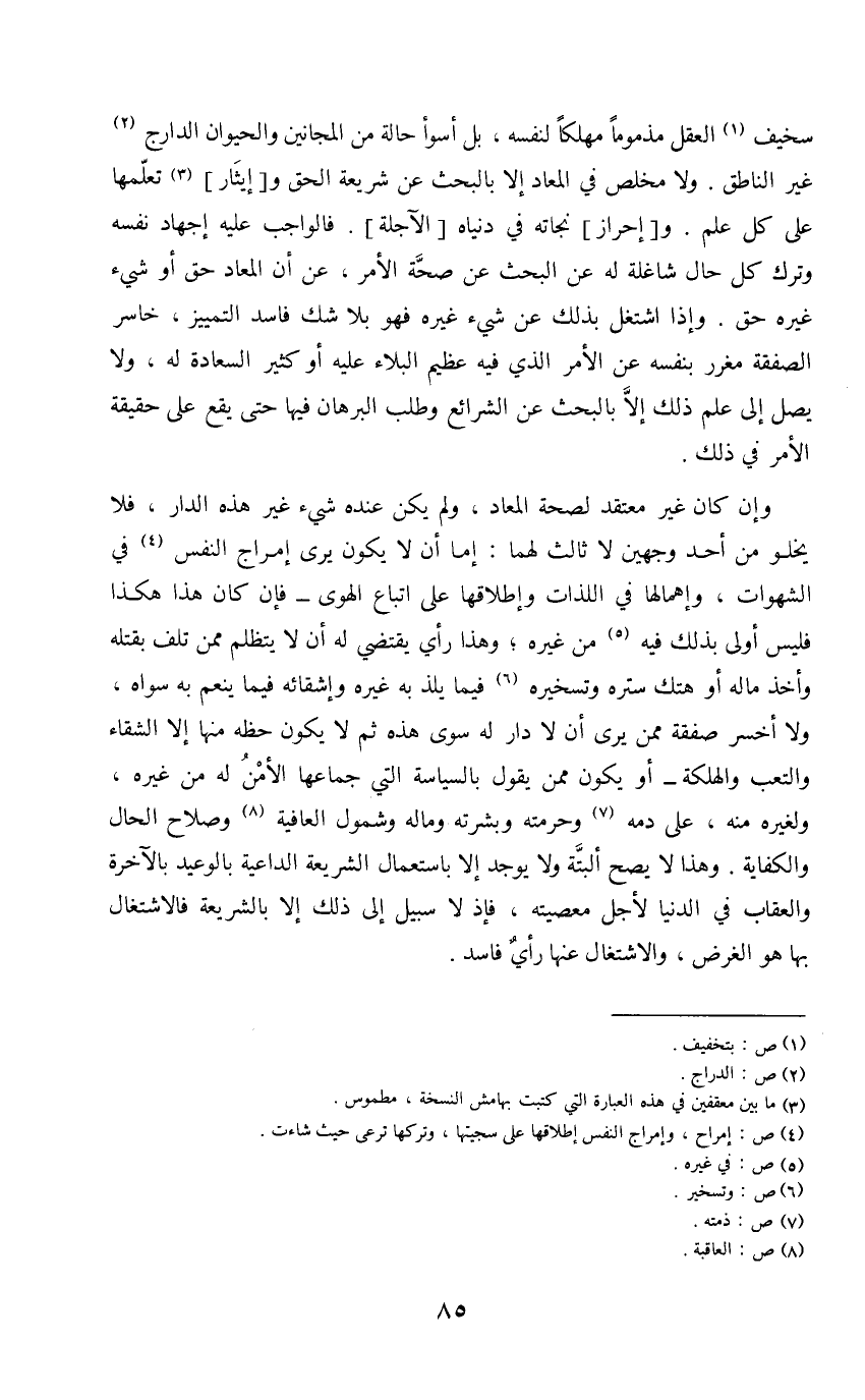 سخيف (1) العقل مذوماً مهلكاً لنفسه، بل أسوأ حالة من المجانين والحيوان الدارج (2) غير الناطق. ولا مخلص في المعاد إلا بالحبث عن شريعة الحق و [إيثار] (3) تعلمها على كل علم. و [الآجلة] . فالواجب عليه إجهاد نفسه وترك كل حال شاغلة له عن البحث عن صحة الأمر، عن أن المعاد حق أو شيء غيره حق. وإذا اشتغل عن شيء غيره فهو بلا شك فاسد التمييز، خاسر الصفقة مغرر بنفسه عن الأمر الذي فيه عظيم البلاء عليه أو كثير السعادة له، ولا يصل إلى علم ذلك إلا بالبحث عن الشرائع وطلب البرهان فيها حتى يقع على حقيقة الأمر في ذلك.