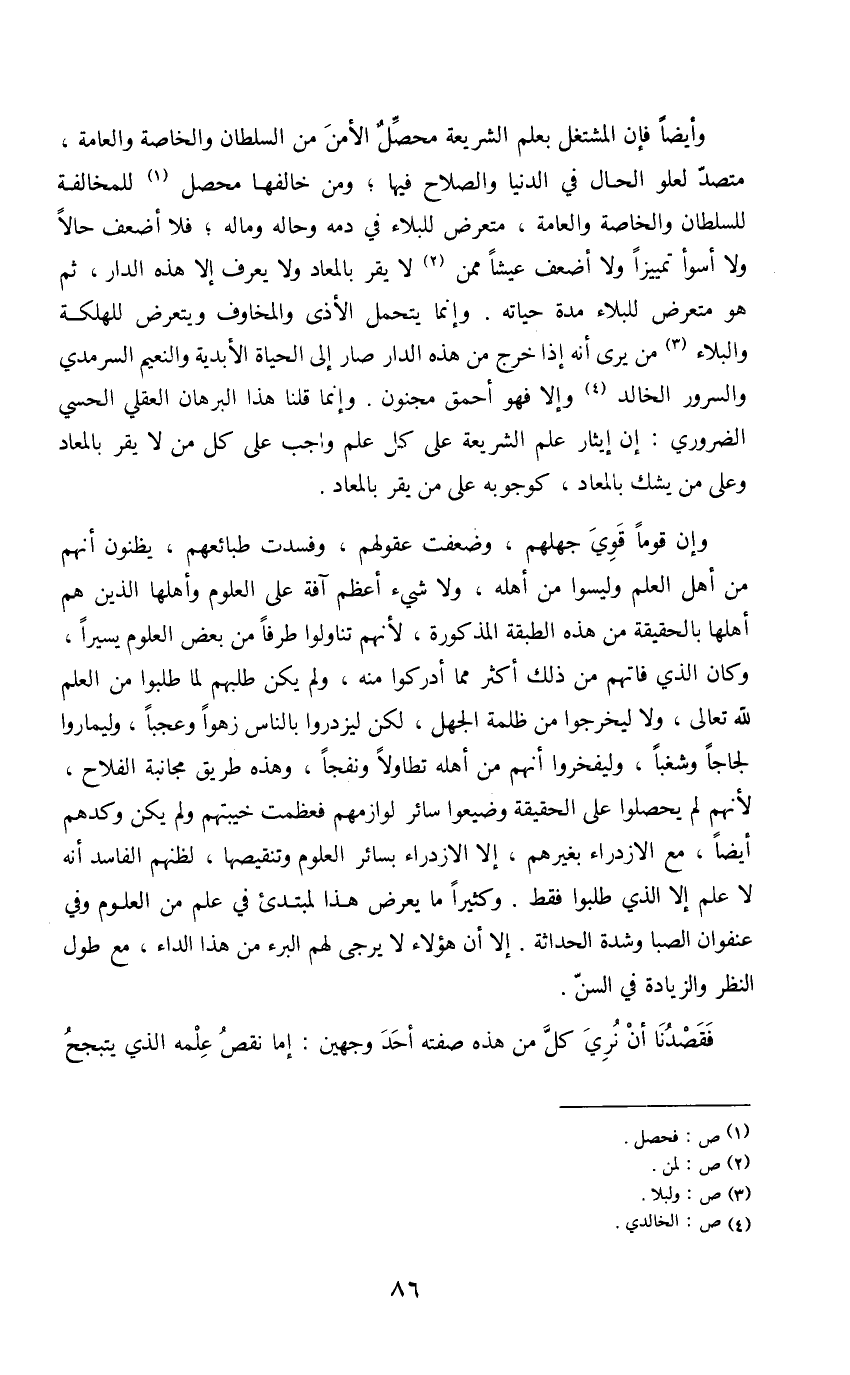 وأيضاً فإن المشتغل بعلم الشريعة محصل الأمن من السلطان والخاصة والعامة، متصد لعلو الحال في الدنيا والصلاح فيها؛ ومن خالفها محصل (1) للمخالفة للسلطان والخاصة والعامة، متعرض للبلاء في دمه وحاله وماله؛ فلا أضعف حالاً ولا أسوأ تمييزاً ولا أضعف عيشاً ممن (2) لا يقر بالمعاد ولا يعرف إلا هذه الدار، ثم هو متعرض للبلاء مدة حياته. وإنما يتحمل الأذى والمخاوف ويتعرض للهلكة والبلاء (3) من يرى أنه إذا خرج من هذه الدار صار إلى الحياة الأبدية والنعيم السرمدي والسرور الخالد (4) وإلا فهو أحمق مجنون. وإنما قلنا هذا البرهان العقلي الحسي الضروري: إن إيثار علم الشريعة على كل علم واجب على كل من لا يقر بالمعاد وعلى من يشك بالمعاد، كوجوبه على من يقر بالمعاد.